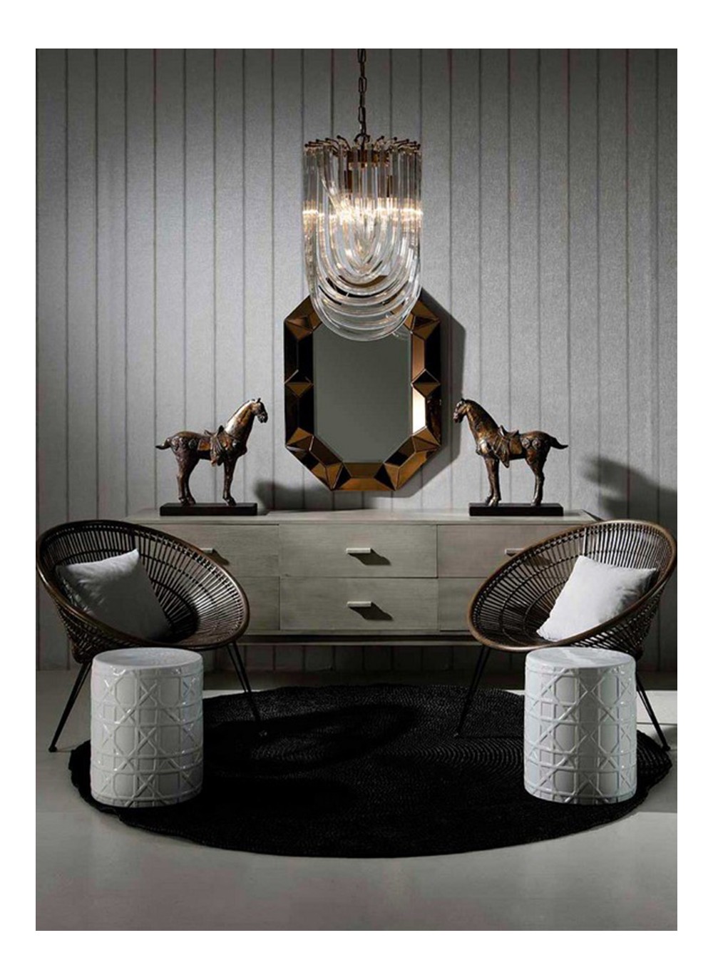 Aparador de madera natural velada con patas de madera rectas oblicuas hacia fuera. Compuesto por seis cajones.