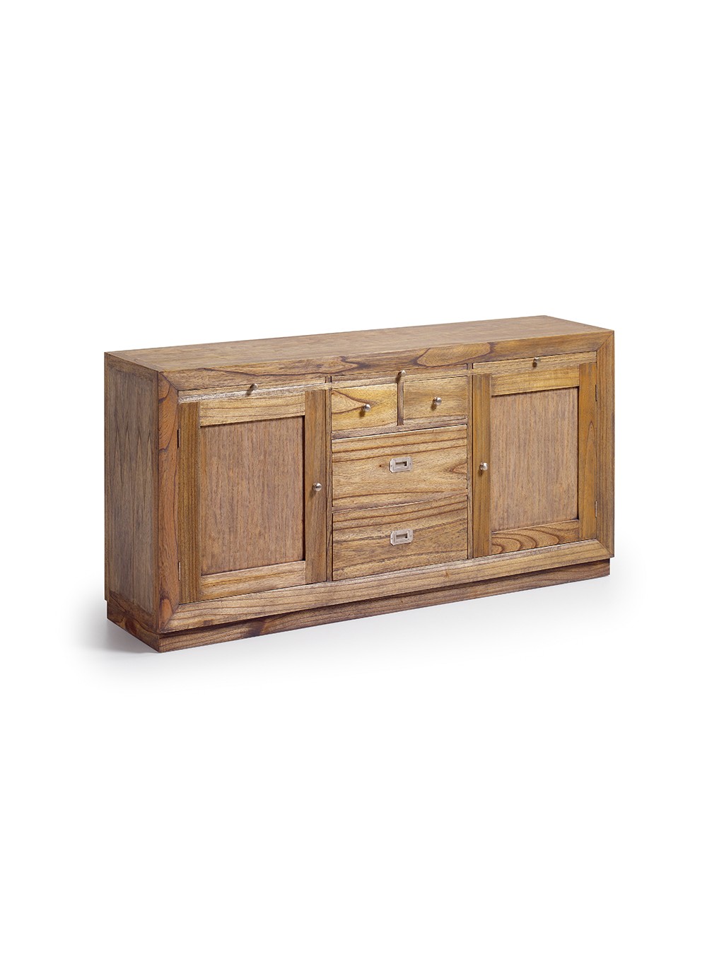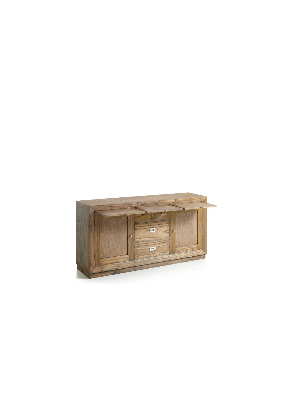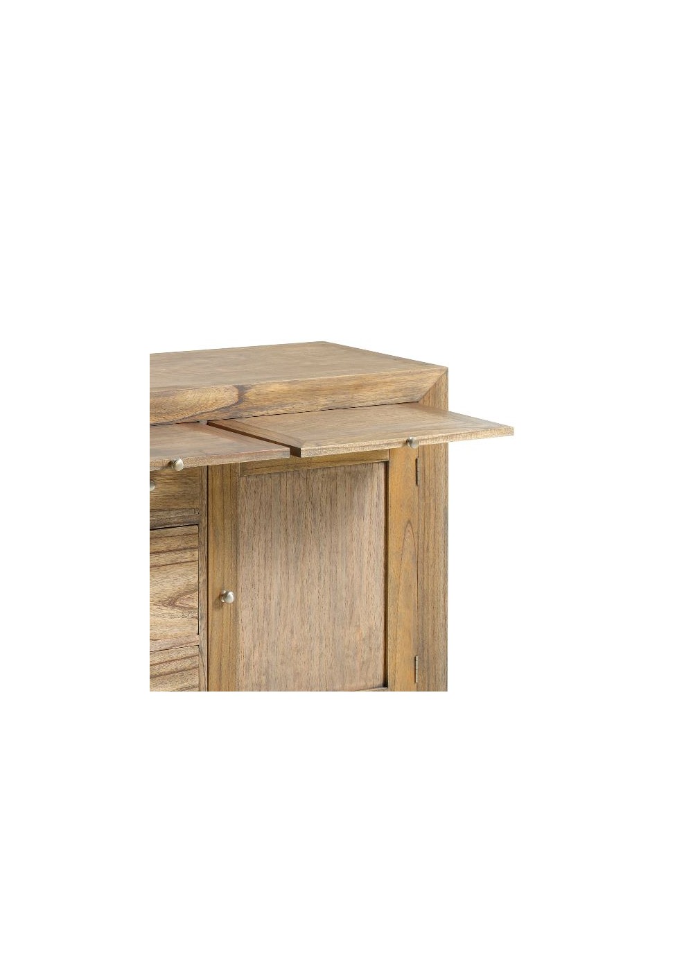 Precioso buffet Merapi compuesto por cuatro cajones, dos puertas y tres bandejas. No requiere montaje. Estantes interiores. Incluye cajón secreter.