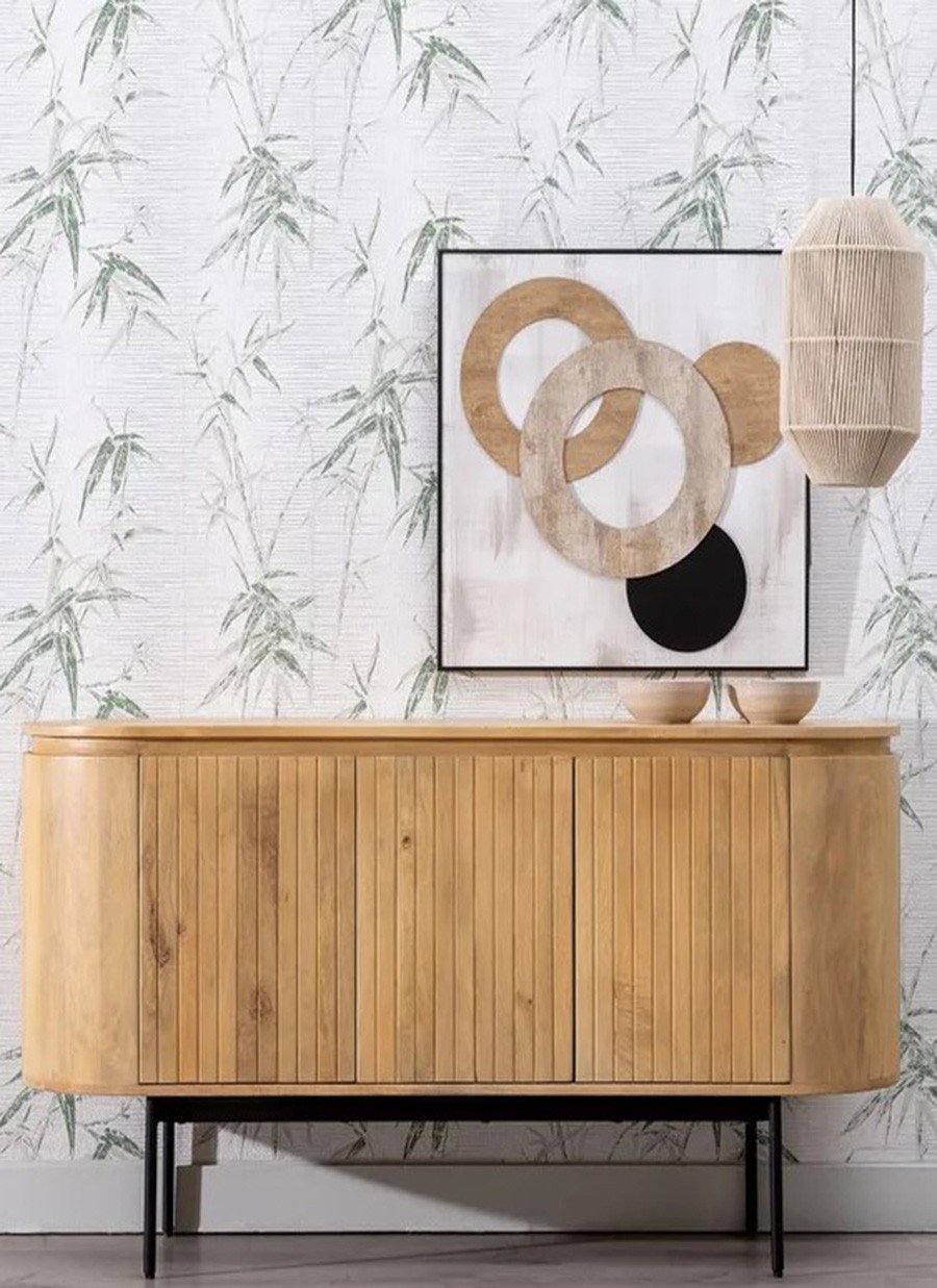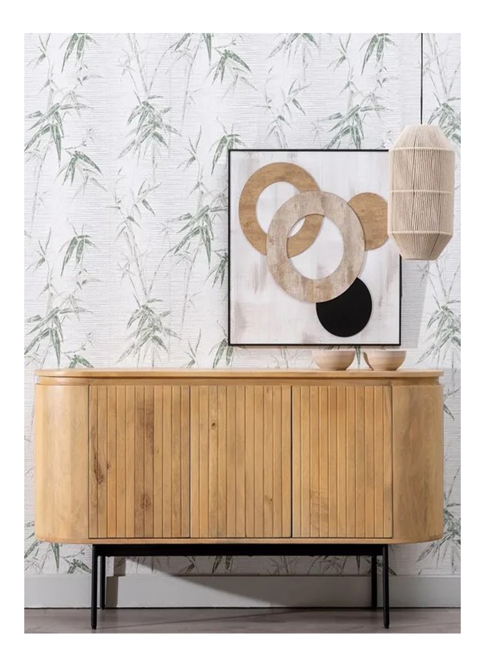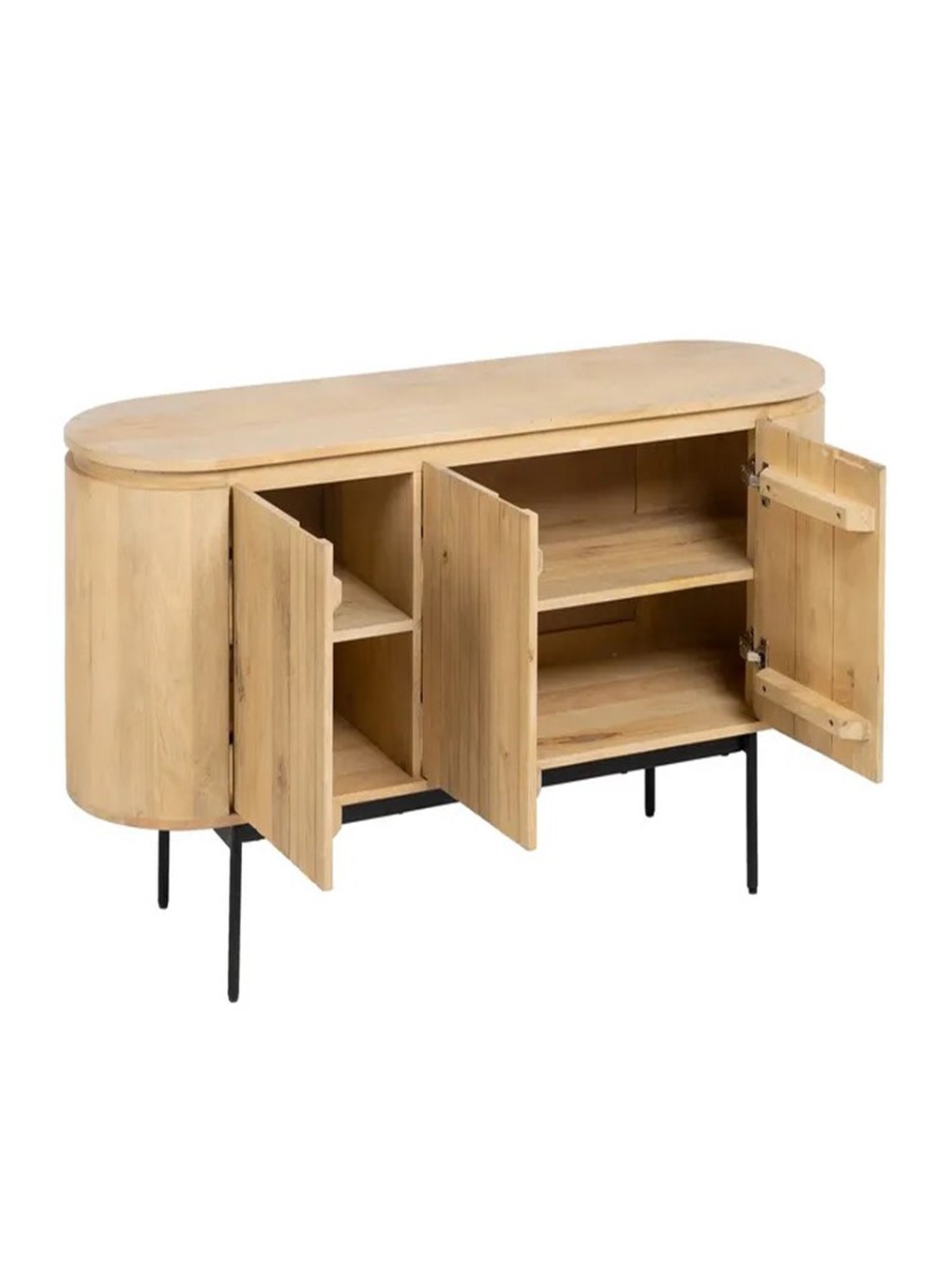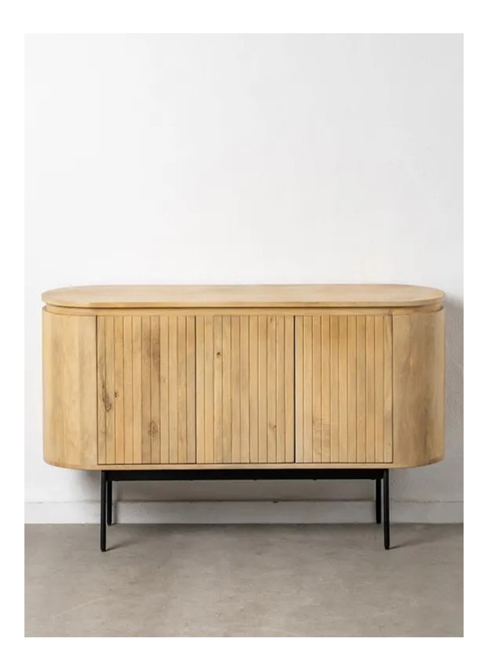 Este aparador está concebido con un tablero en madera natural de mango, realzado por un acabado cálido que destaca las vetas originales, y patas de hierro negro mate de 25 cm de altura que aportan robustez y ligereza visual. Las 3 puertas con paneles verticales grabados ofrecen un detalle texturizado que evoca diseños artesanales, mientras la estructura industrial aporta equilibrio y carácter moderno al conjunto.