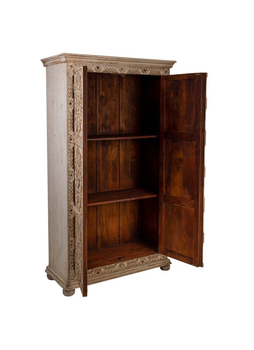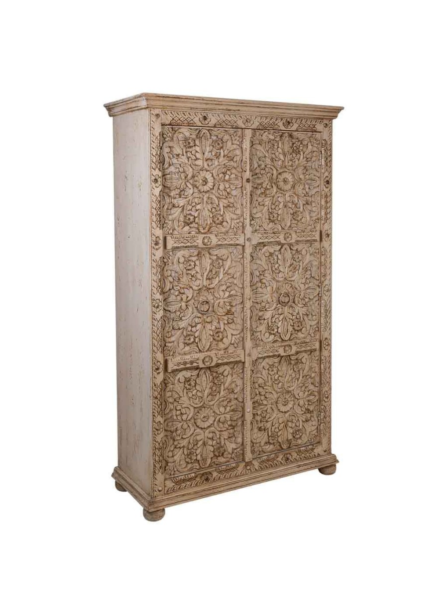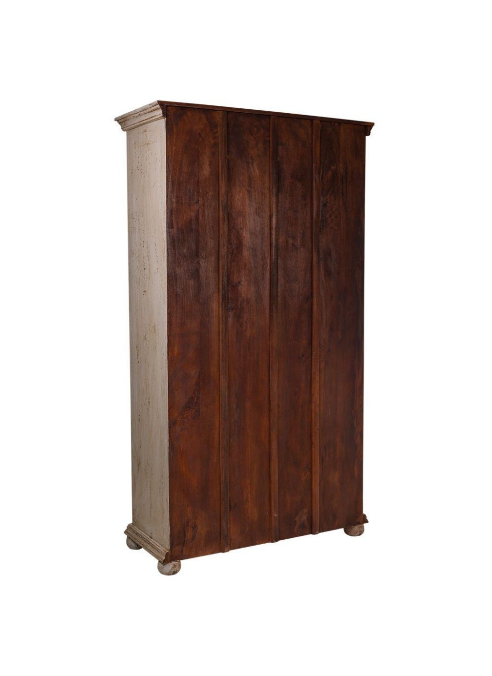 Este armario presenta una estética refinada con acabado blanco artesanal sobre madera maciza, lo que aporta luminosidad visual y un estilo natural con acabado ligeramente rústico. Sus dimensiones (102 cm de ancho × 44 cm de fondo × 183 cm de alto) lo convierten en una solución compacta pero generosa en capacidad, adaptándose tanto a espacios dormitoriales como recibidores o zonas de almacenamiento.