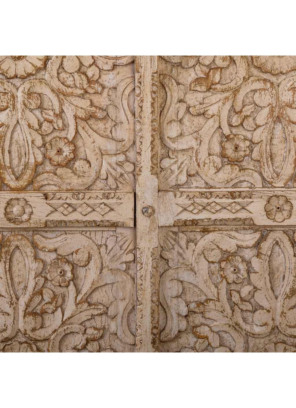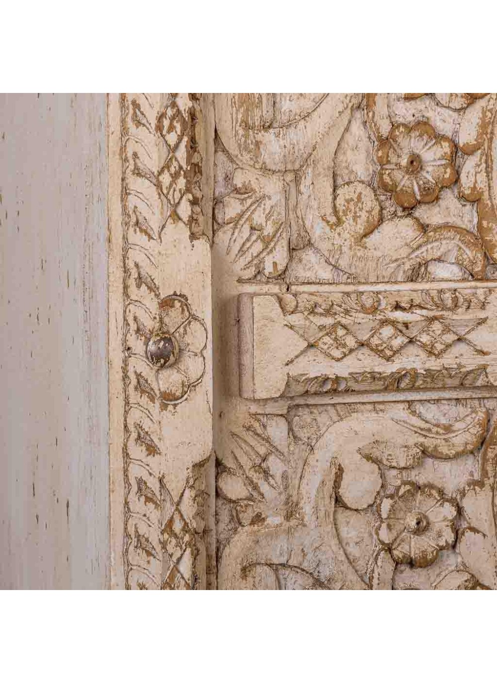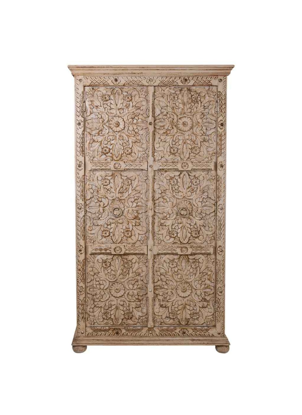 Este armario presenta una estética refinada con acabado blanco artesanal sobre madera maciza, lo que aporta luminosidad visual y un estilo natural con acabado ligeramente rústico. Sus dimensiones (102 cm de ancho × 44 cm de fondo × 183 cm de alto) lo convierten en una solución compacta pero generosa en capacidad, adaptándose tanto a espacios dormitoriales como recibidores o zonas de almacenamiento.