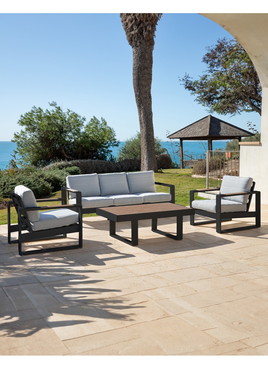 Set compuesto por sofá 3 plazas + 2 sillones + 1 mesa aluminio antracita. Detalle de resina imitación madera en los reposabrazos.