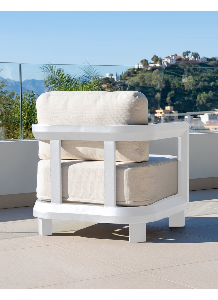 Set compuesto por sofá 3 plazas, 2 sillones y mesa de centro. Aluminio blanco. Cojinería de color beige. Tablero de mesa de piedra sintética blanca.