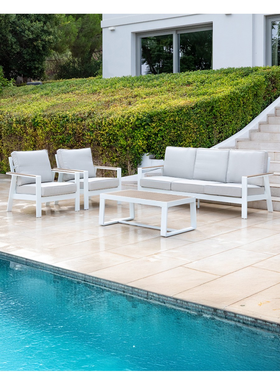 Compuesto por sofá 3 plazas, 2 sillones y mesa de centro. Aluminio blanco. Reposabrazos y tablero de mesa de aluminio imitación madera. Cojinería de 12cm de color gris claro.