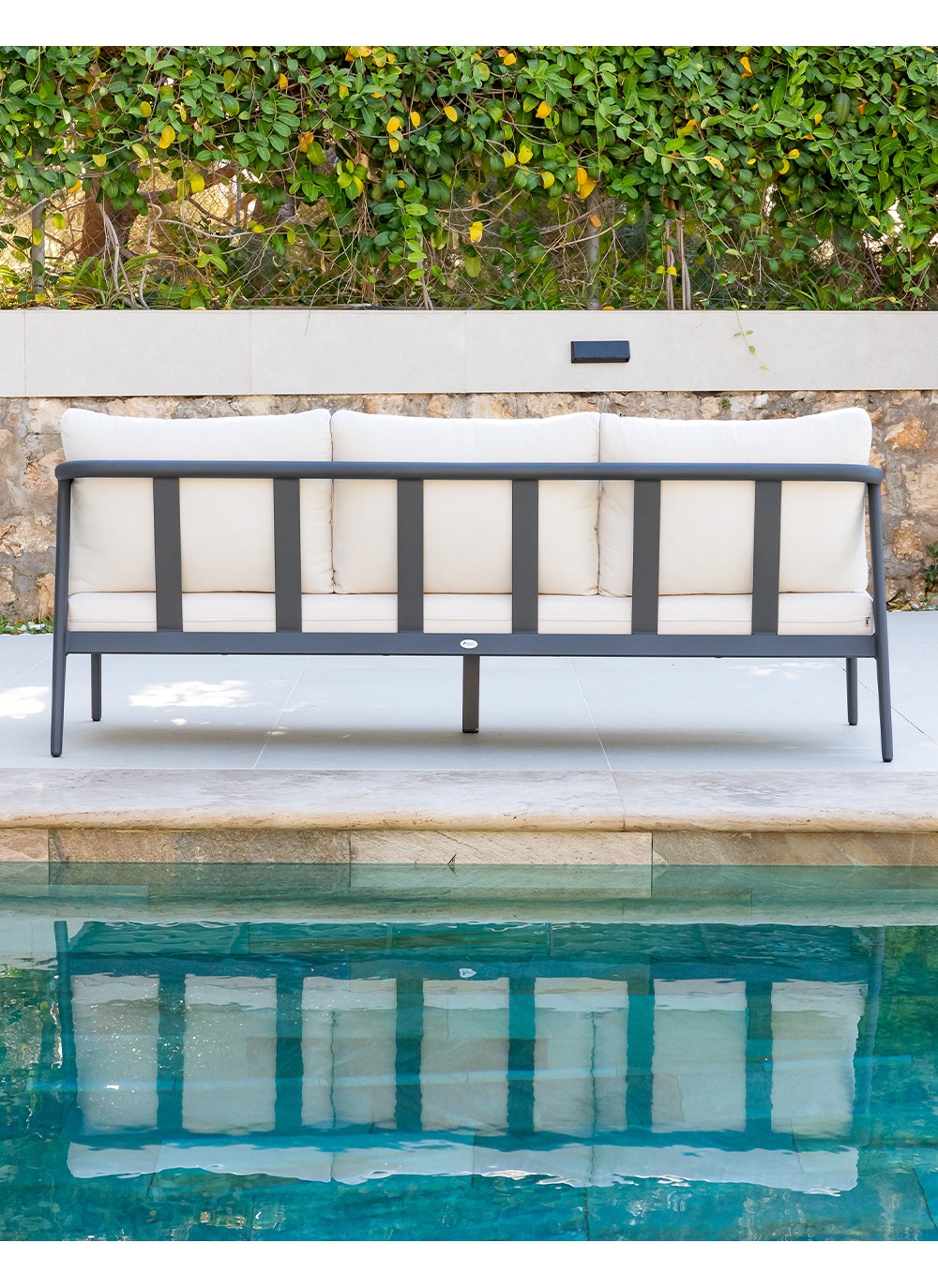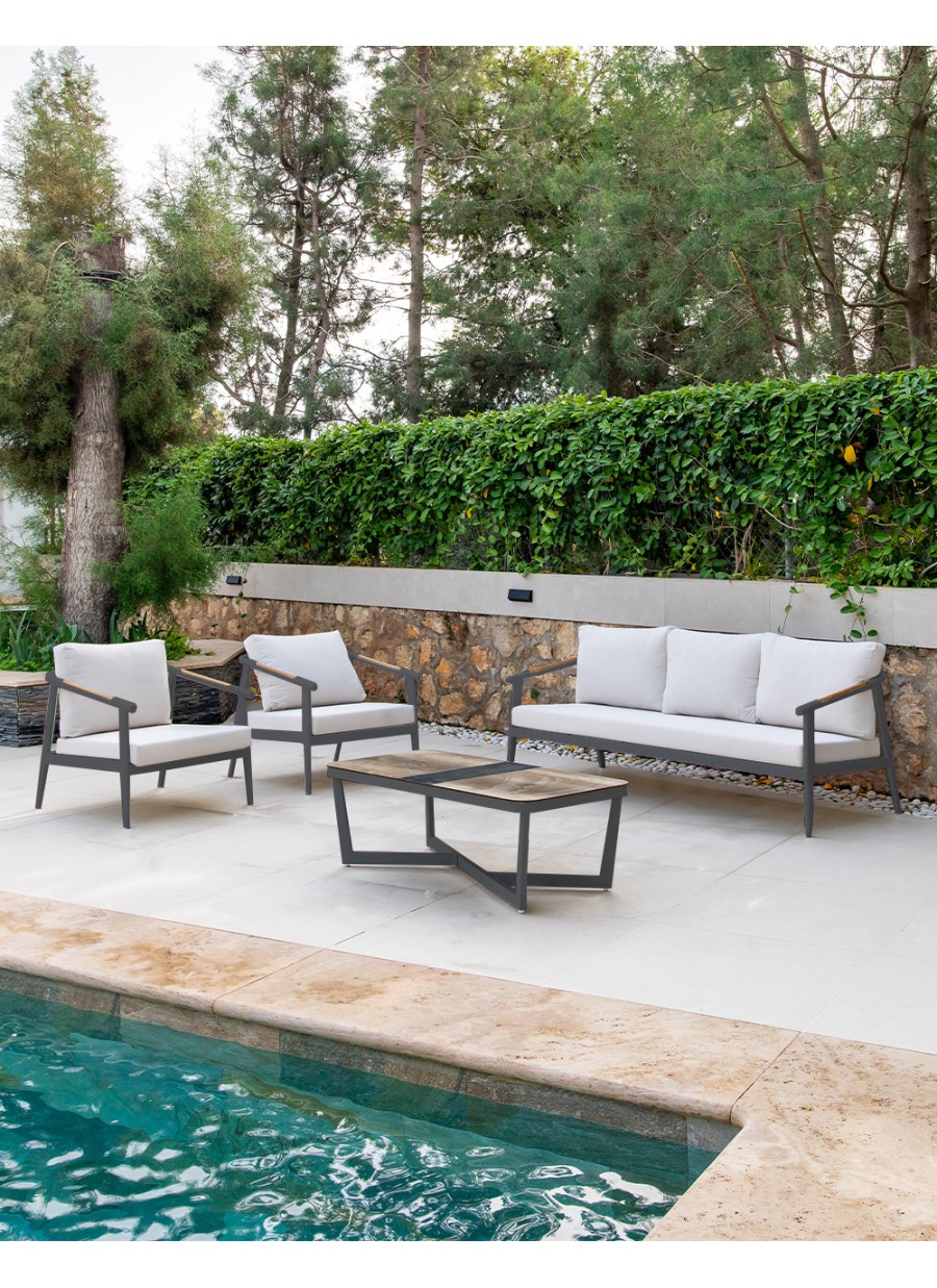 Set jardín Kenya sofá de 3 plazas y 2 sillones con mesa de centro en aluminio antracita. Cojinería en color beige. detalle de resina imitación madera en los reposabrazos. Mesa de aluminio y tablero de hpl imitación madera.