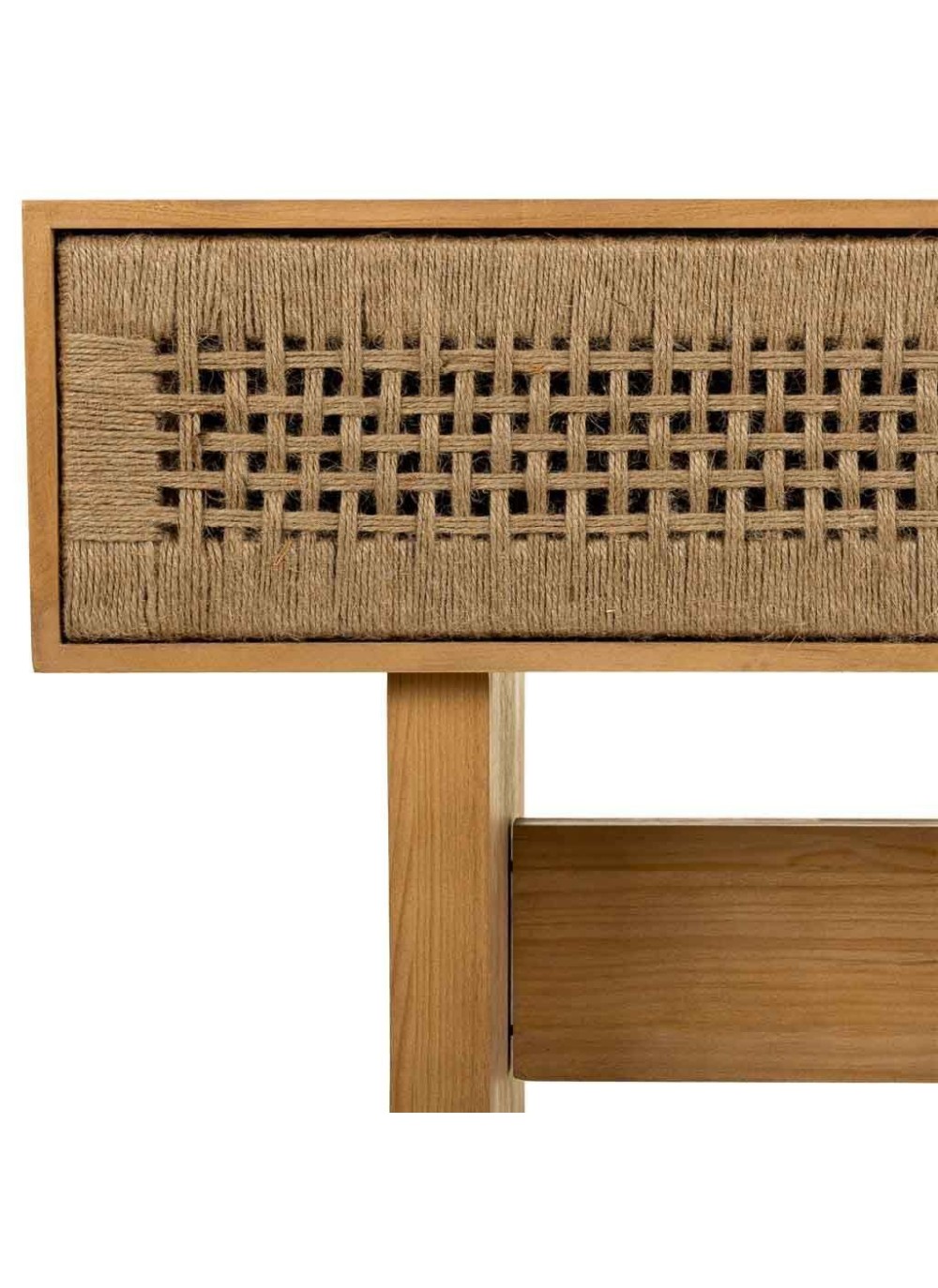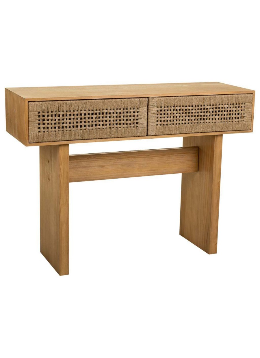Recibidor fabricado en madera y cuerda trenzada de dos cajones con acabado marrón. Una pieza perfecta para combinarla con artículos modernos.
