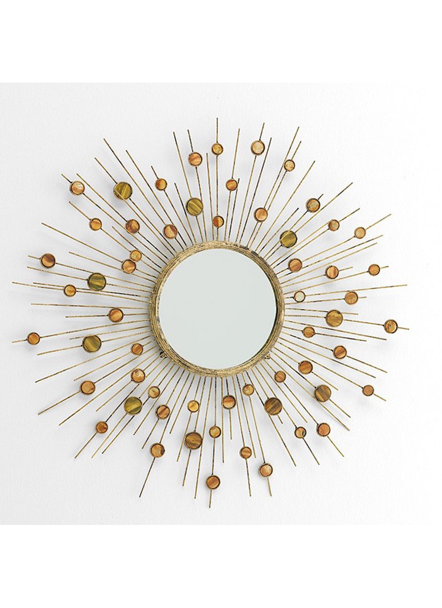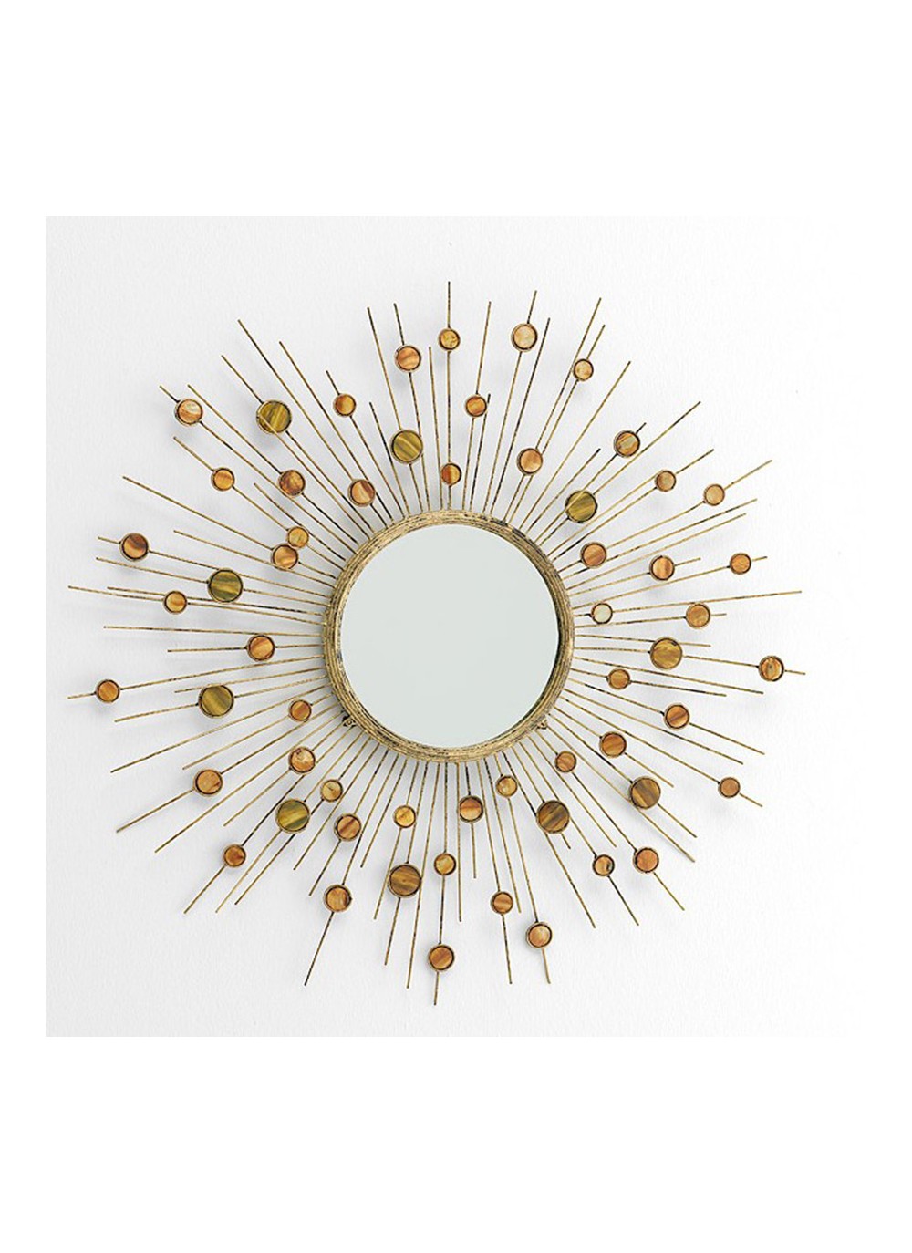 Espejo decorativo circular para pared de metal color oro con detalles en nácar.
