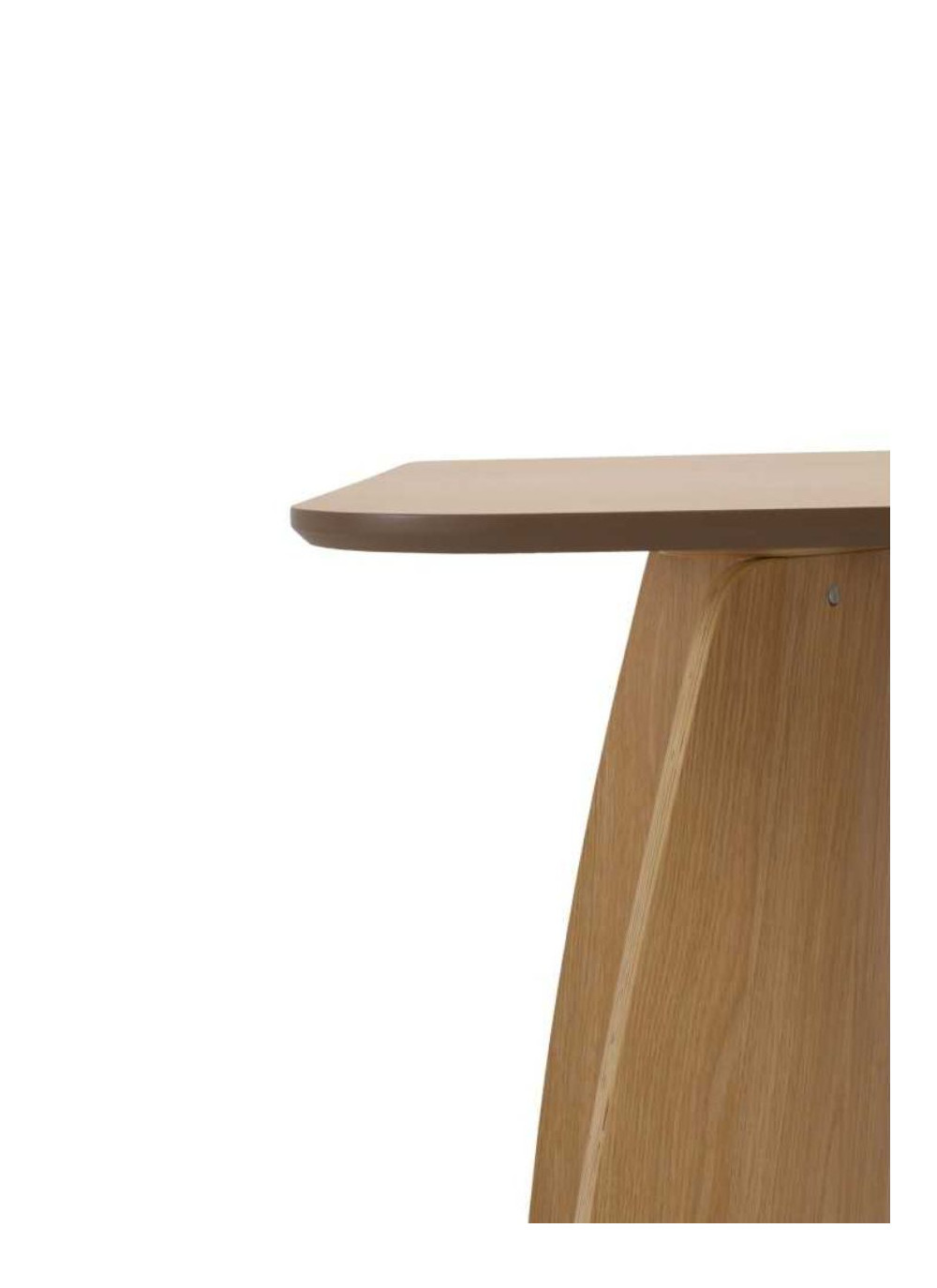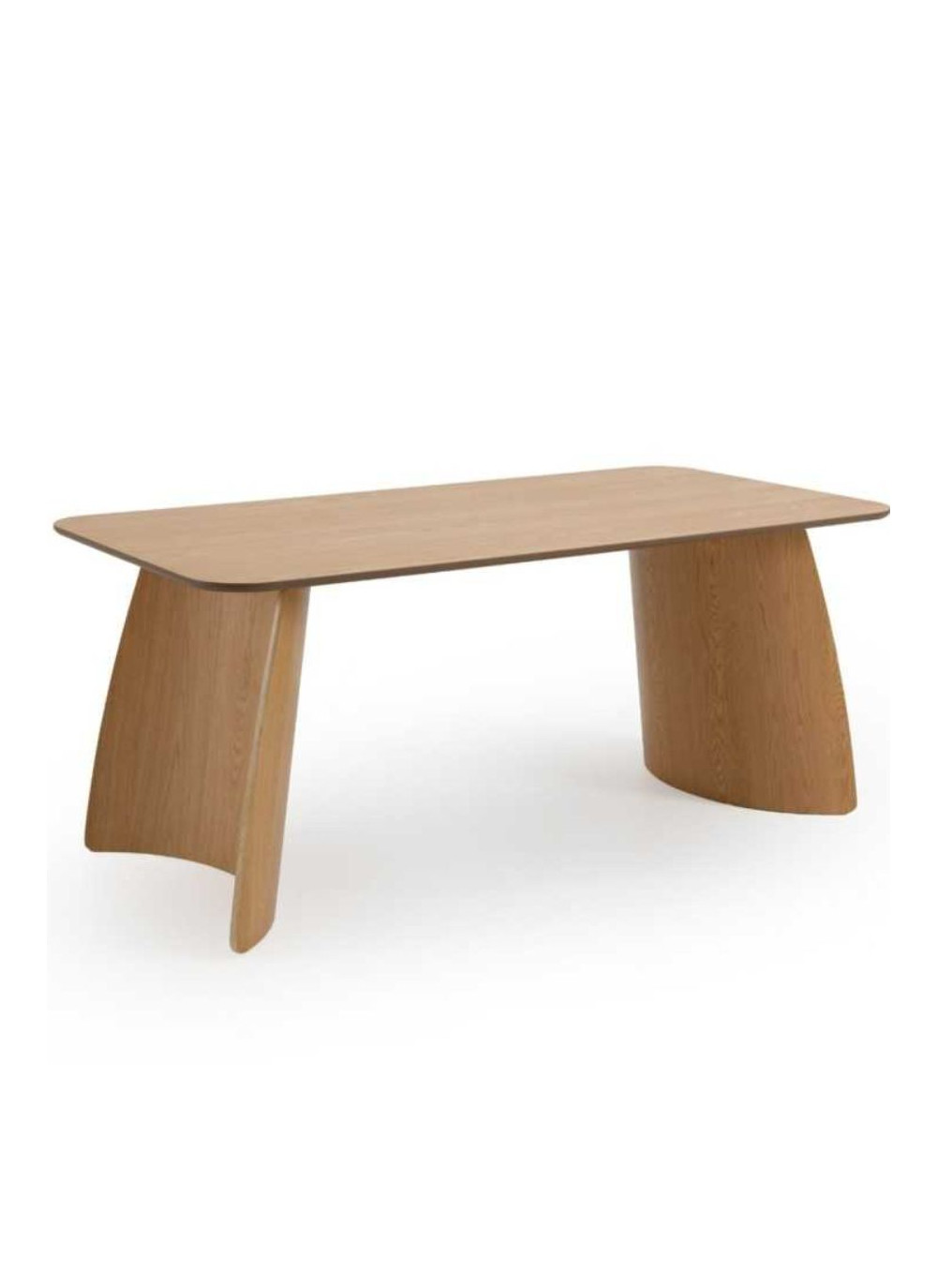 Materiales: Estructura de madera contrachapada de roble con acabado en tono natural. Diseño rectangular con esquinas redondeadas que aportan suavidad estética. Tablero de 2 cm de grosor y bases arqueadas que proporcionan estabilidad y un estilo moderno. Espacio interior entre patas de 110 cm, ideal para 6 comensales. Requiere montaje de patas.