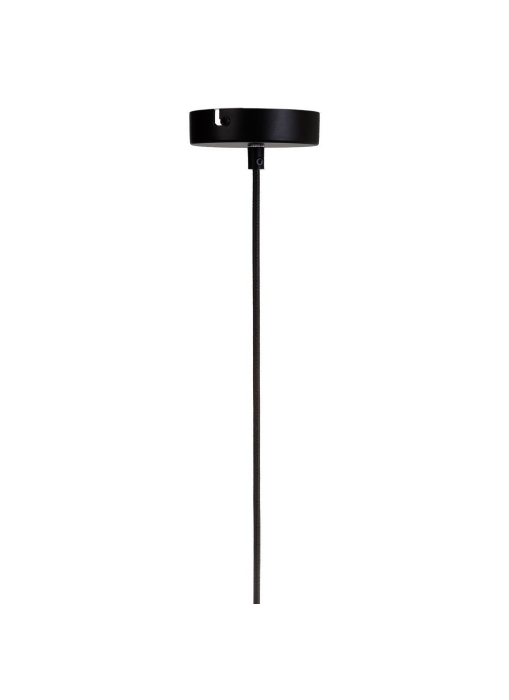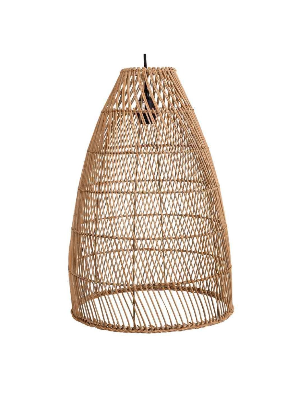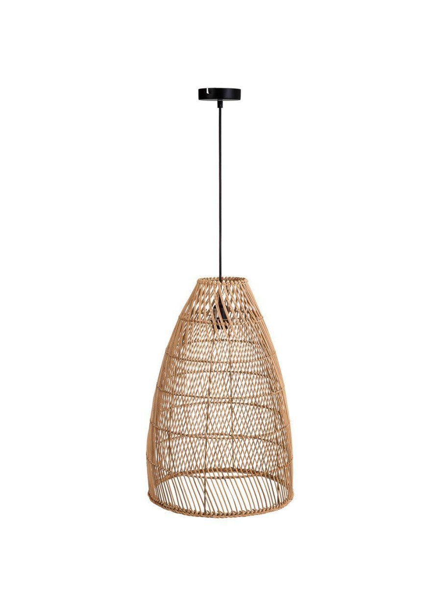 Se trata de una lámpara de techo confeccionada con fibras vegetales (ratán), entretejidas sobre una estructura metálica, con unas dimensiones ideales de 34 cm de diámetro y 51 cm de alto, perfecta para iluminar con elegancia sin ser invasiva.