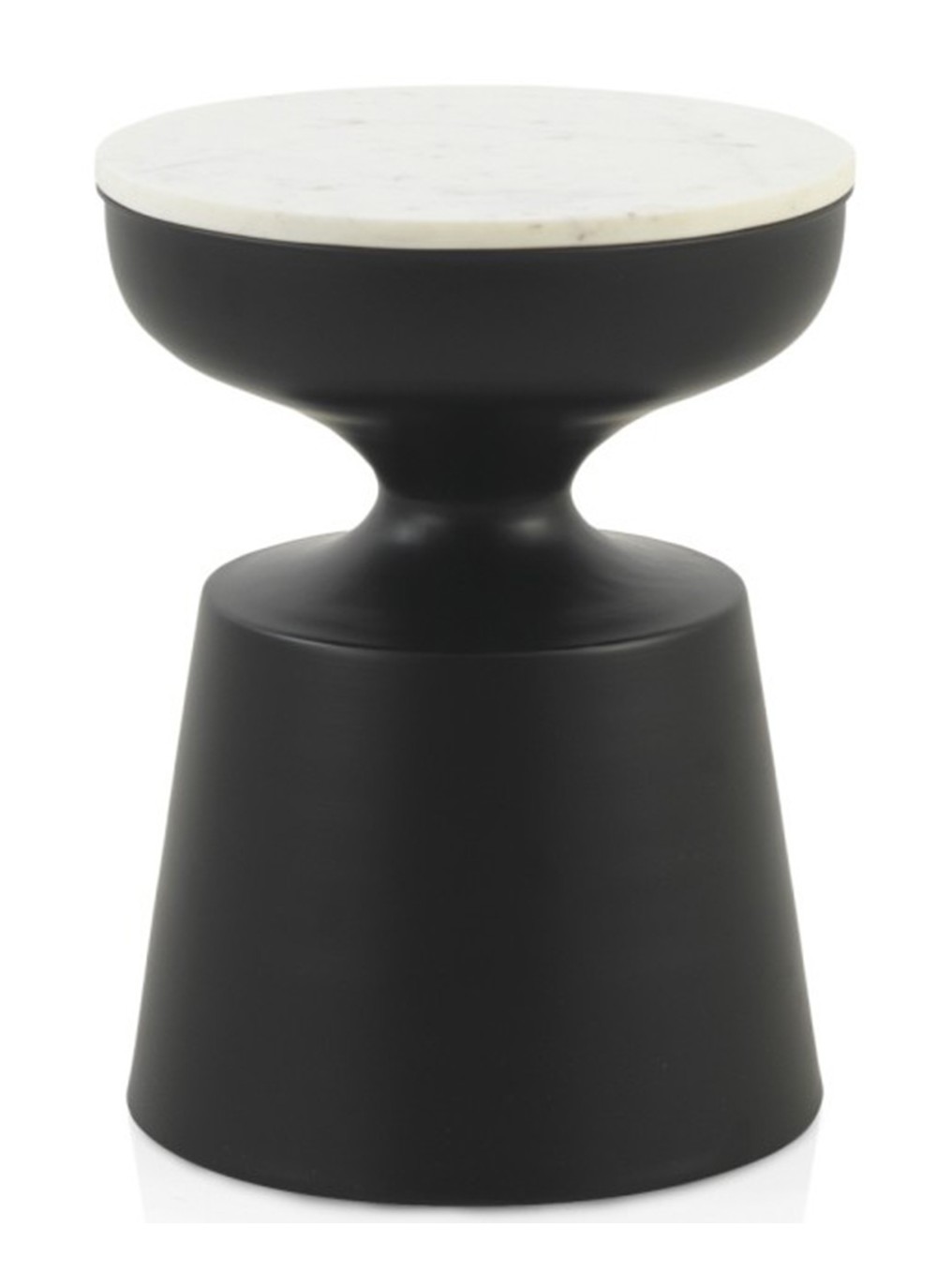 Mesa auxiliar con base de metal negro y sobre de mármol blanco.