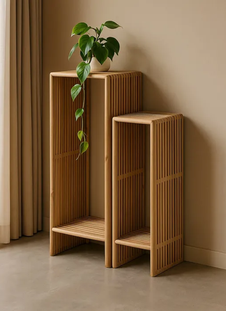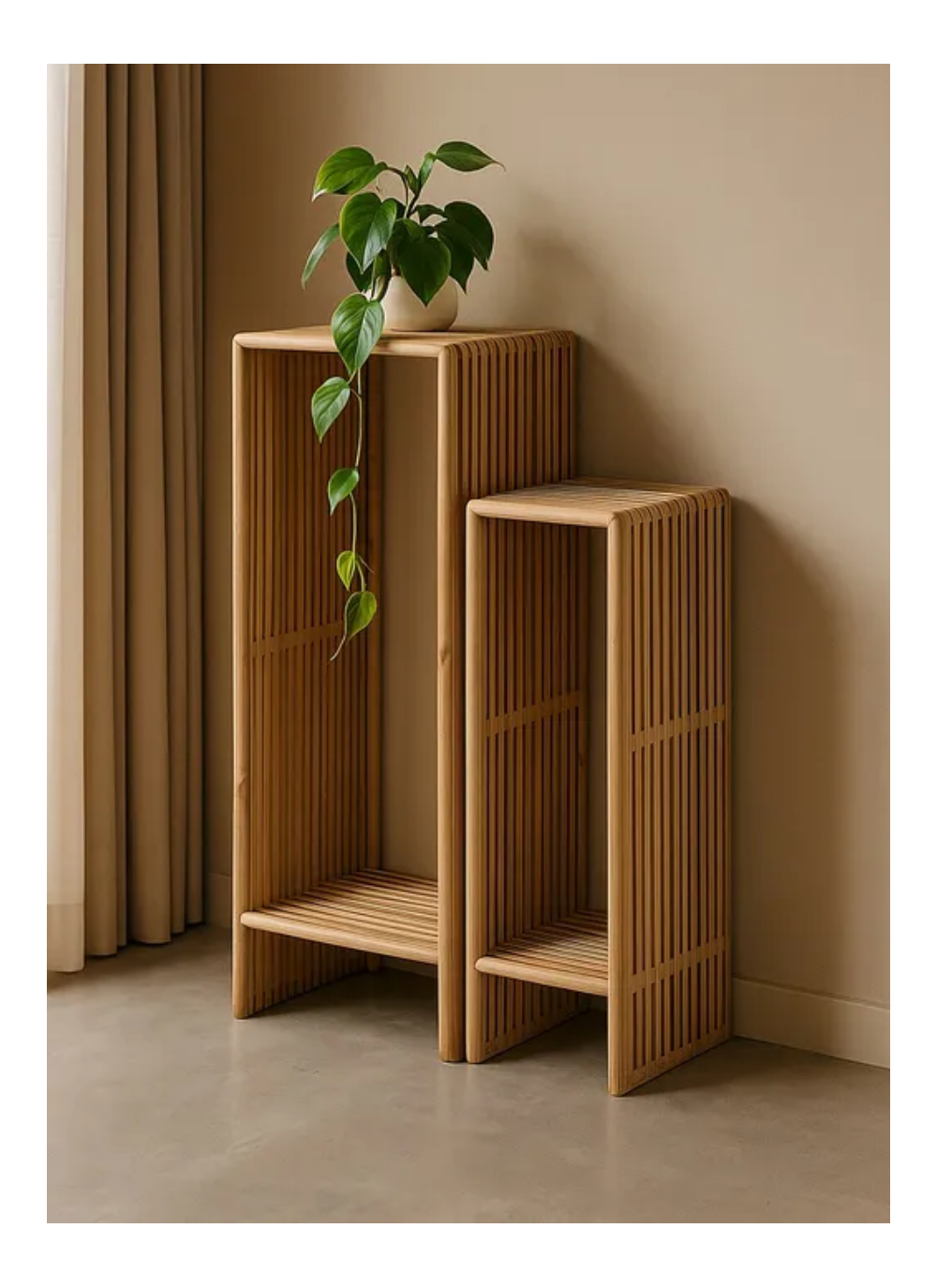 Las Mesas Auxiliares Cava de Teca destacan por su silueta alargada y vertical, con proporciones cuidadosamente equilibradas: 33 cm de ancho, 27 cm de profundidad y 86 cm de altura. Esta configuración aporta elegancia y sutileza visual, ideal para espacios que requieren funcionalidad sin restar amplitud visual. Su estructura minimalista permite que la mesa se convierta en un soporte alto y esbelto, perfecto para lámparas, plantas o como elemento auxiliar en entradas.