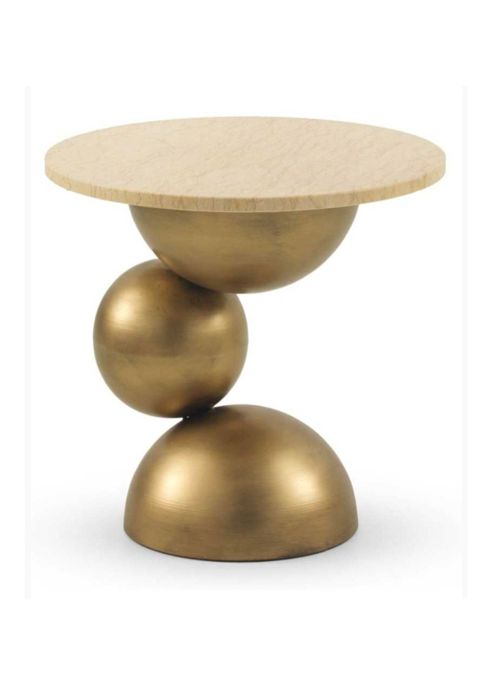 La Mesa Auxiliar Metal y Mármol Combina una base metálica en tono oro viejo mate con un sobre redondo de mármol crema, logrando una mezcla de glamour y calidez que se integra con cualquier estilo decorativo desde minimalista hasta clásico.