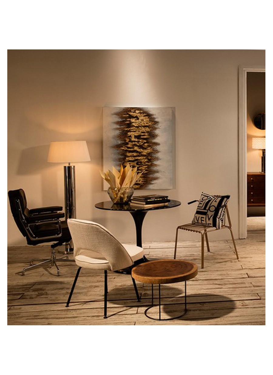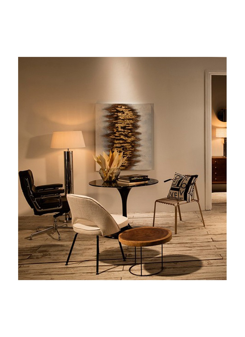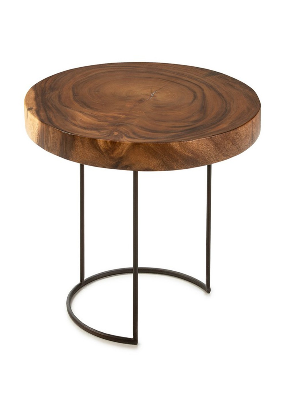 Mesa auxiliar circular con estructura de metal pintada en color negro y madera natural.