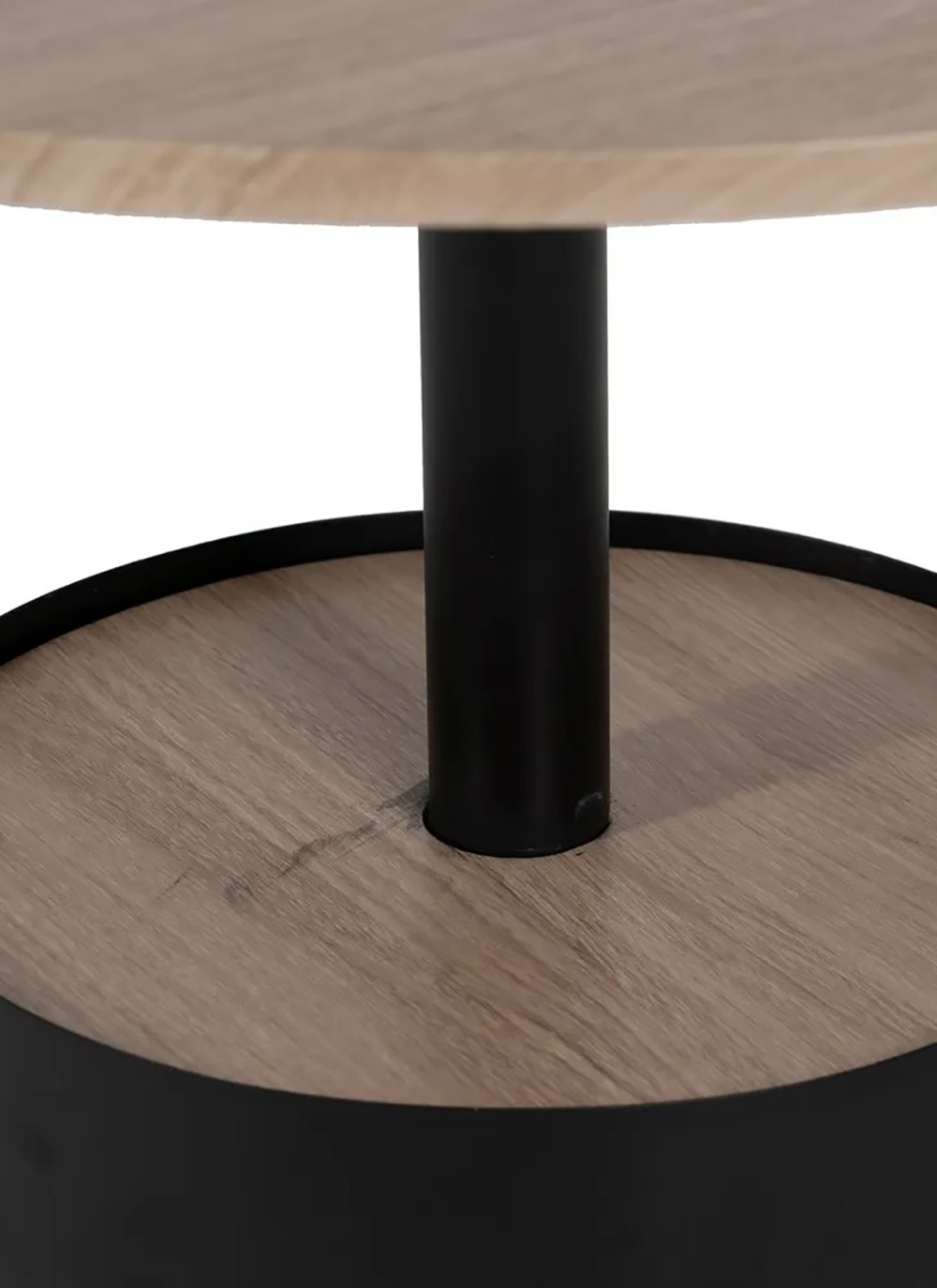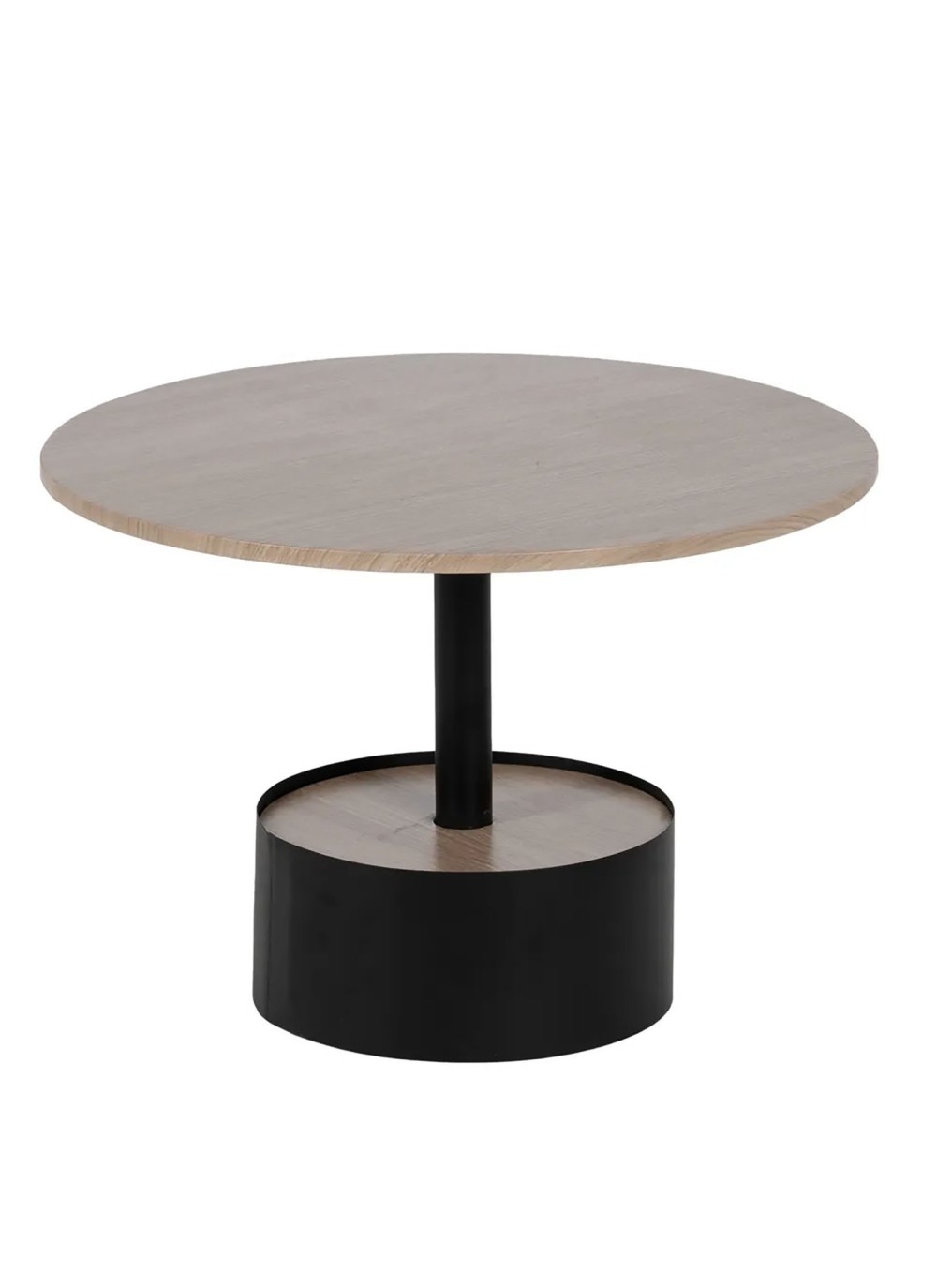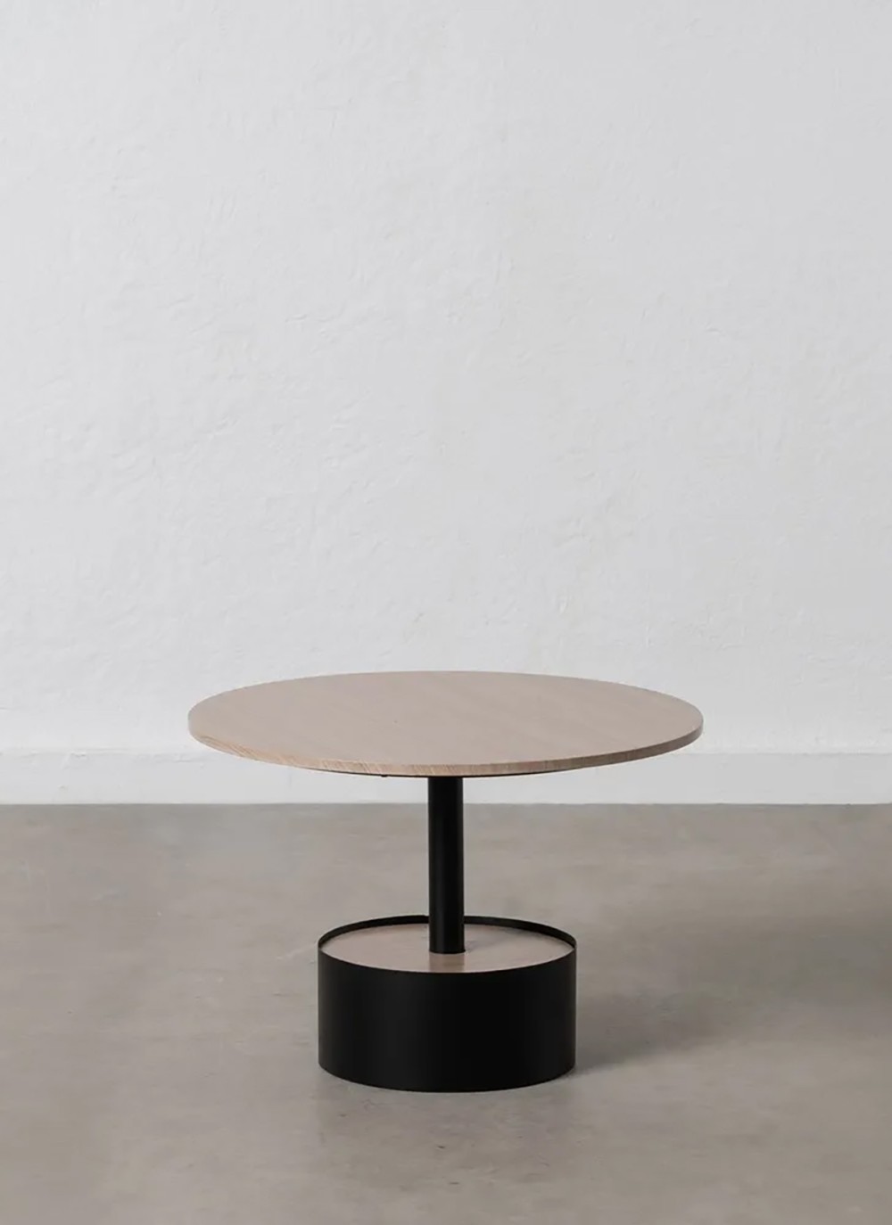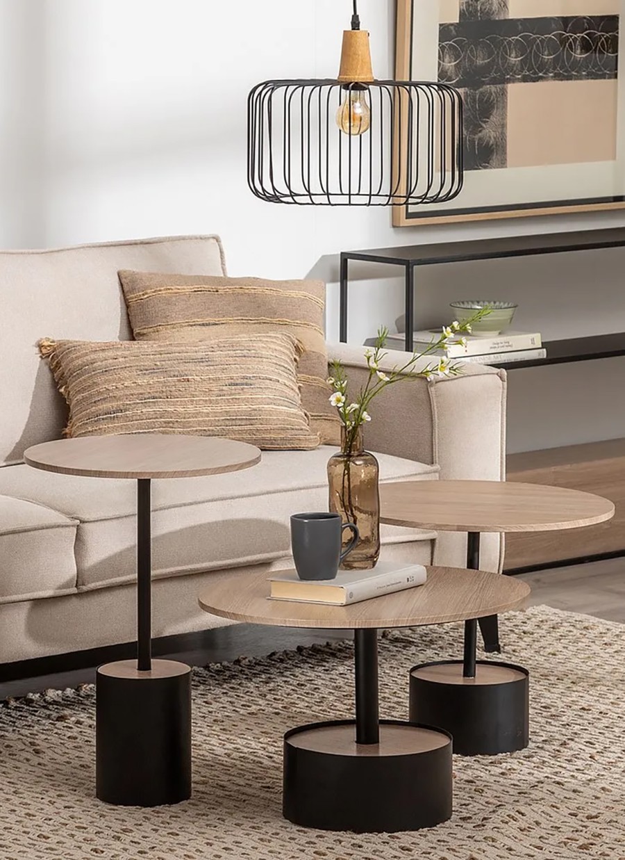 La Mesa Cádiz presenta un formato compacto redondo de 65 × 65 cm con una altura ideal de 37,5 cm, que la convierte en una mesa de centro funcional y elegante. La estructura combina un sobre de madera maciza o de tonalidad natural con una base de metal negro mate o acabado carbón, fusionando calidez natural y estética contemporánea de manera equilibrada.