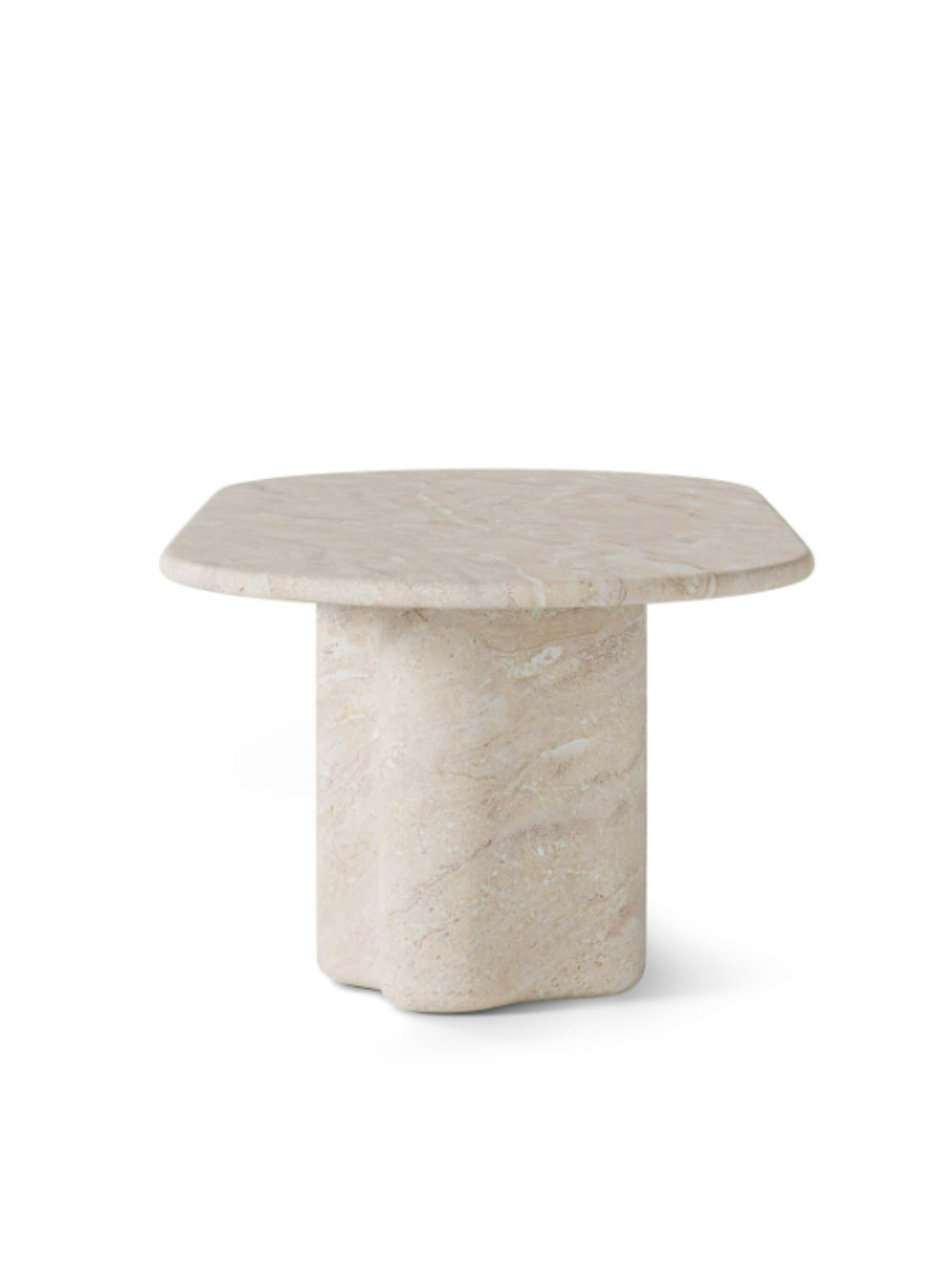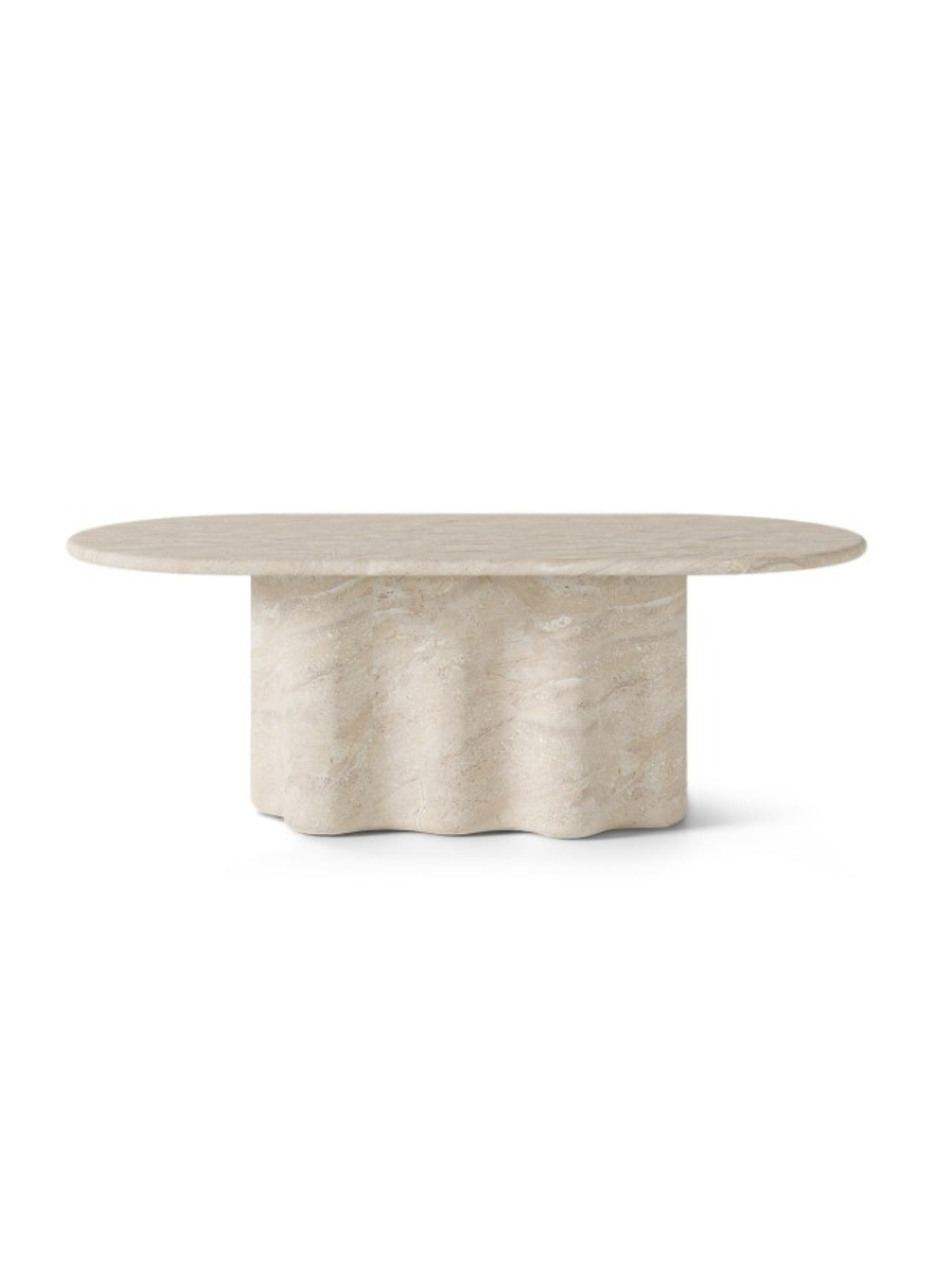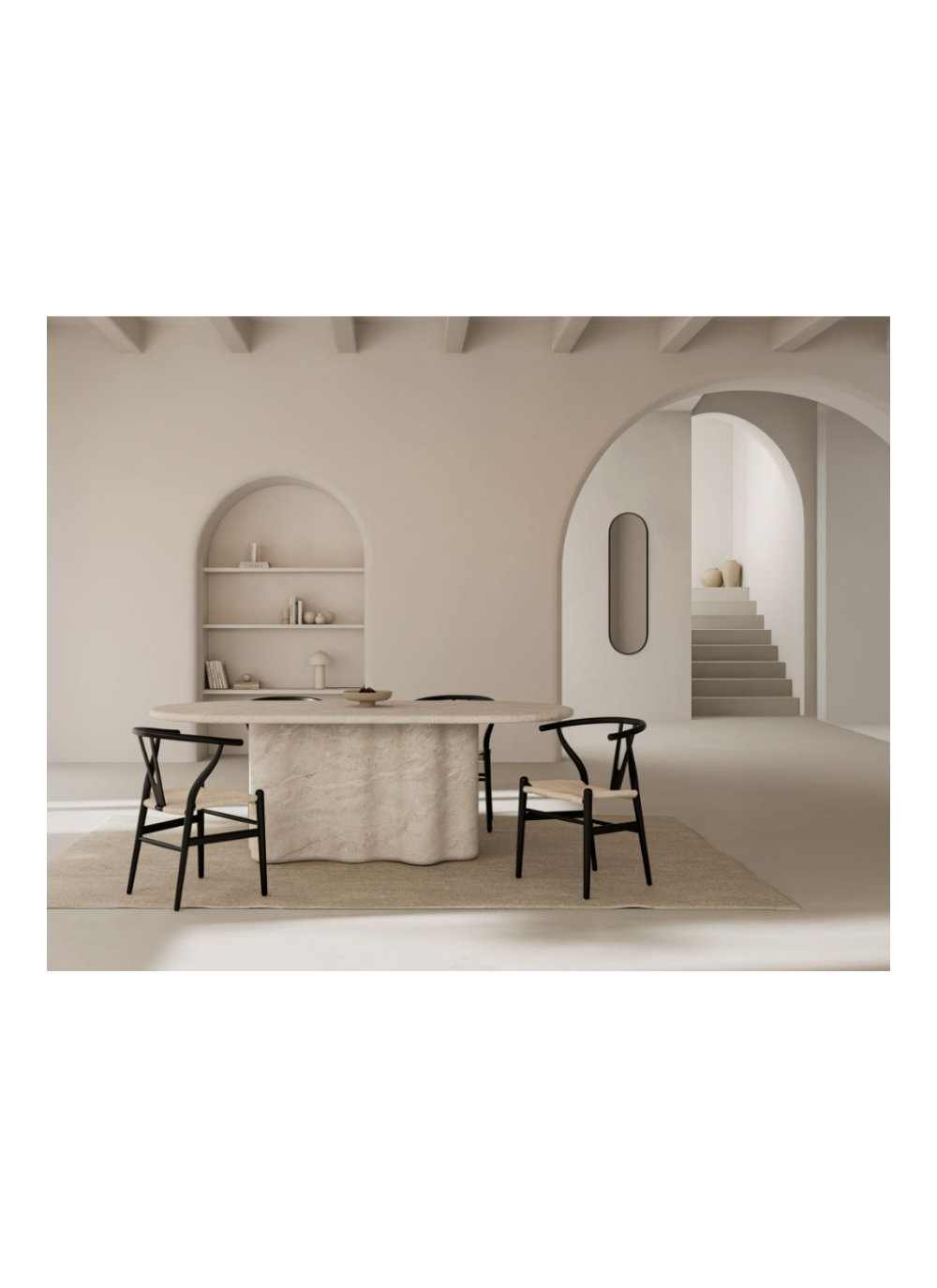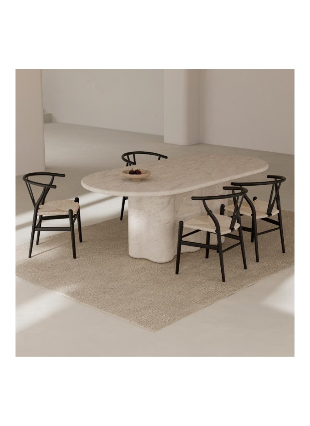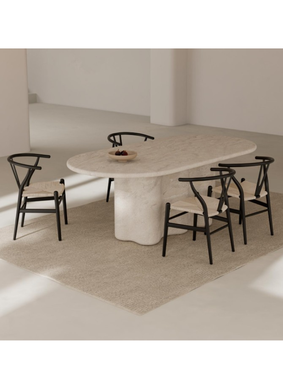 Ánfora es una mesa de comedor fabricada en cemento con un acabado de mármol travertino que aporta una textura natural y cálida, ofreciendo un equilibrio entre sofisticación y atemporalidad. Su diseño de líneas curvas y base sólida le da un aspecto contemporáneo y elegante, combinando funcionalidad y presencia estética.