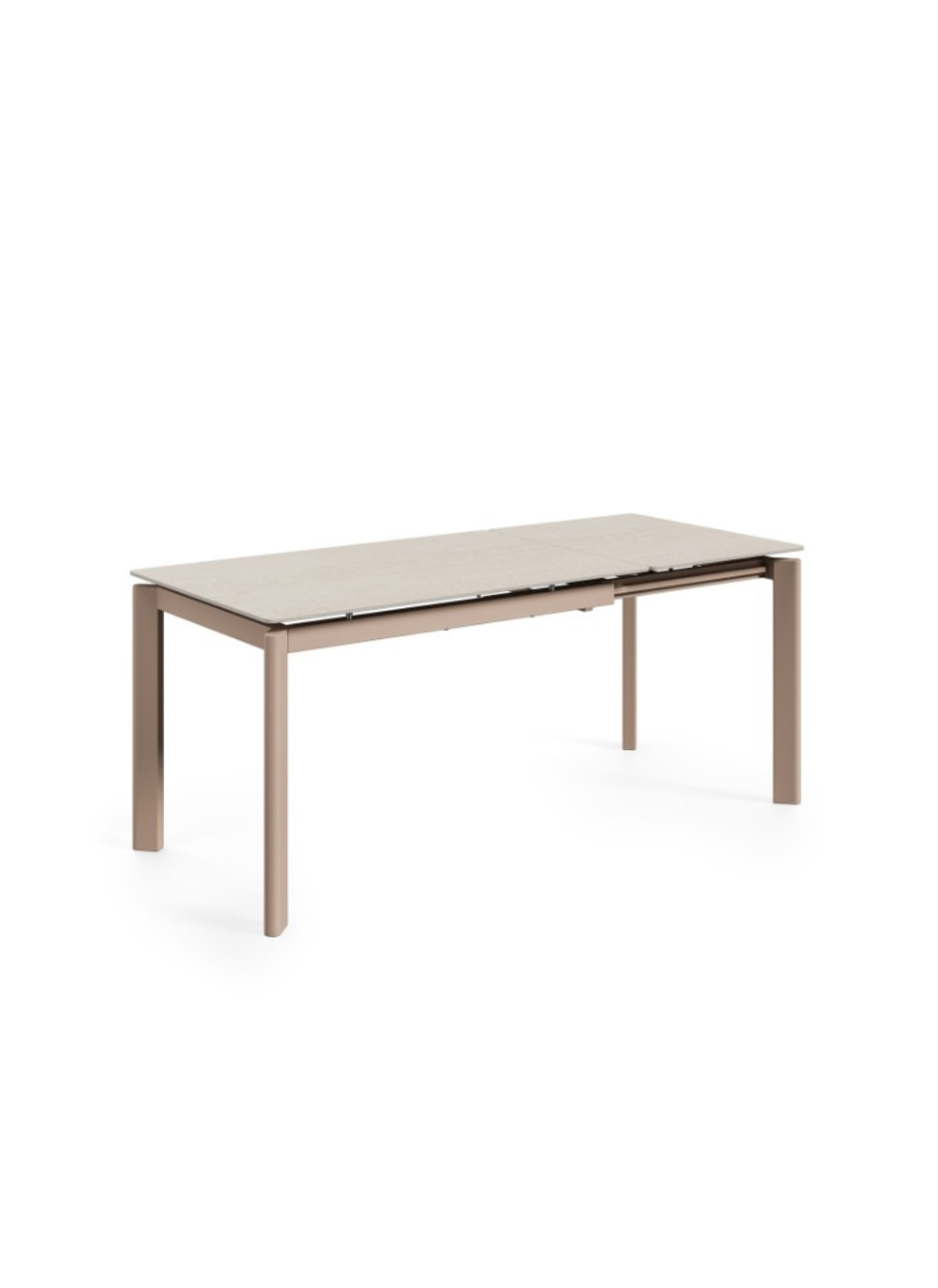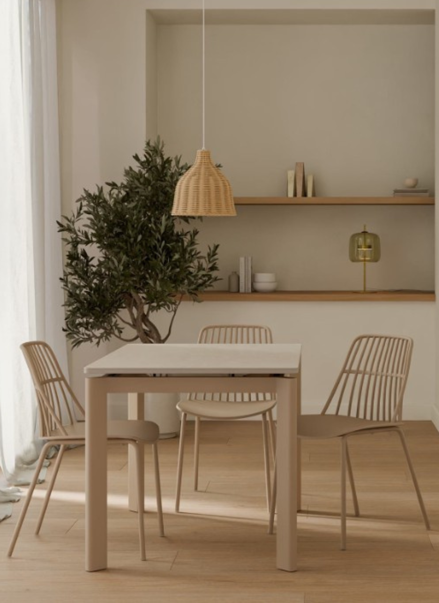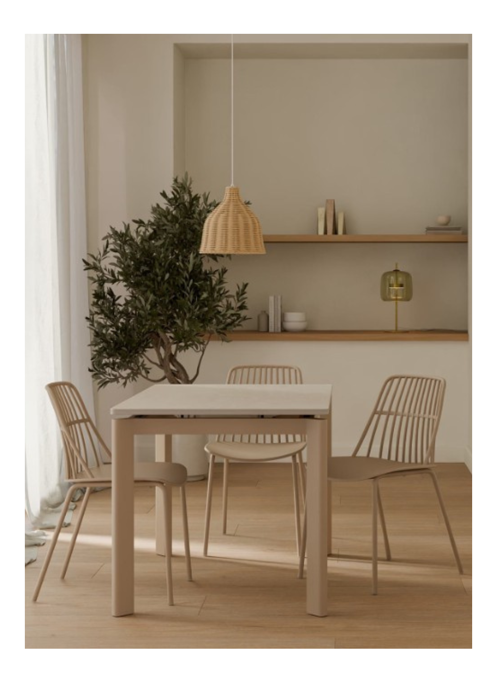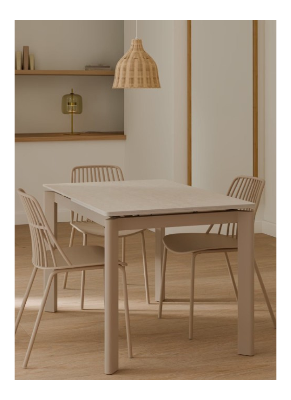 La mesa Arezzo combina elegancia natural y funcionalidad en un diseño pensado para adaptarse tanto a las necesidades diarias como a ocasiones especiales. Esta mesa presenta una tapa de porcelánico con acabado efecto travertino en tonos beige, que evoca la textura y el tono cálido de la piedra natural al tiempo que ofrece una superficie resistente, fácil de limpiar y duradera. Además, cuenta con patas de metal que proporcionan estabilidad y un toque moderno al conjunto.