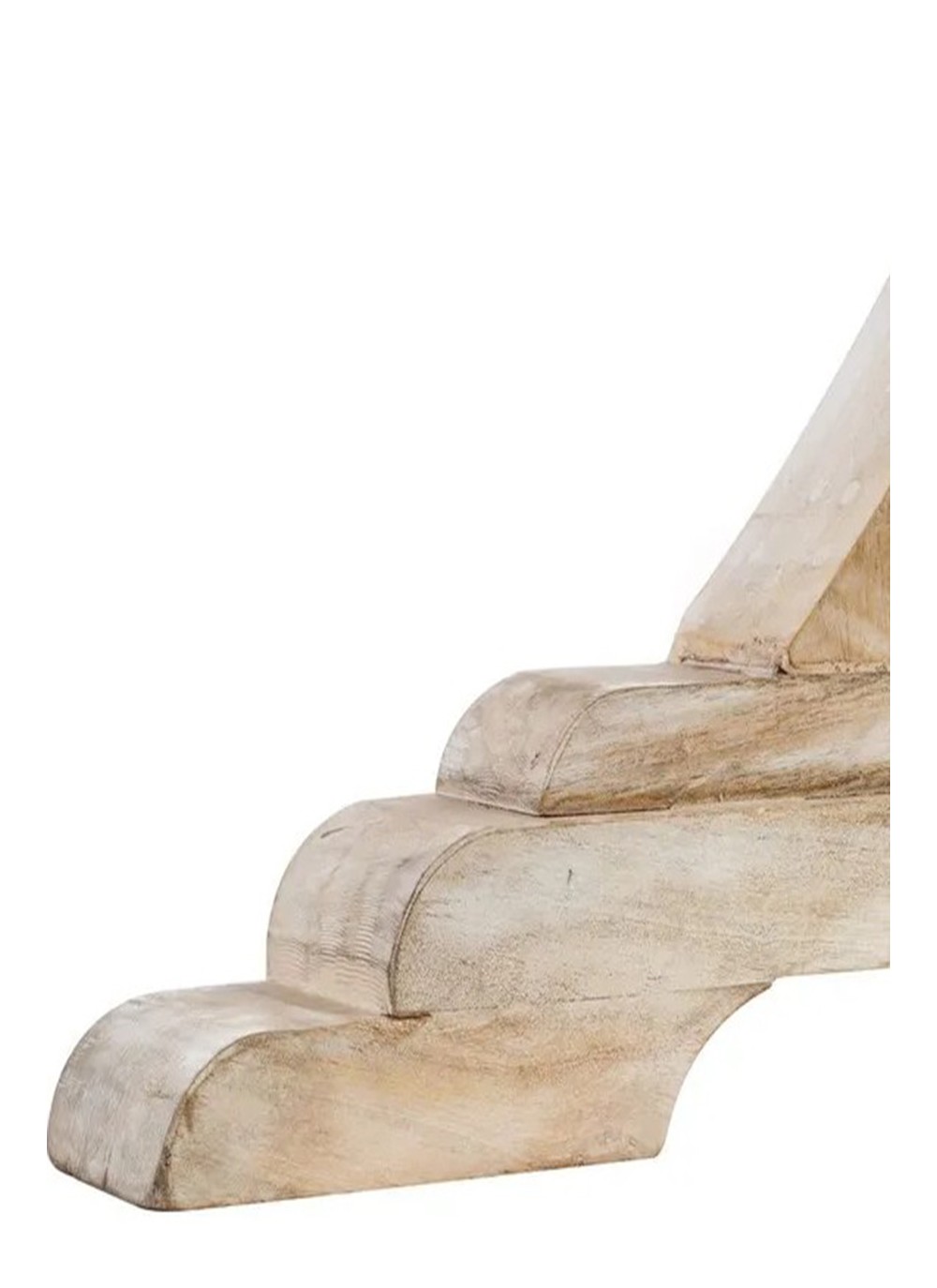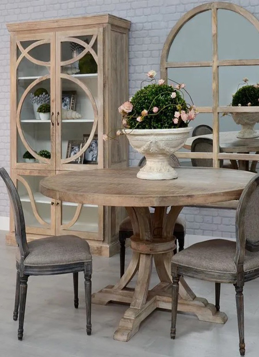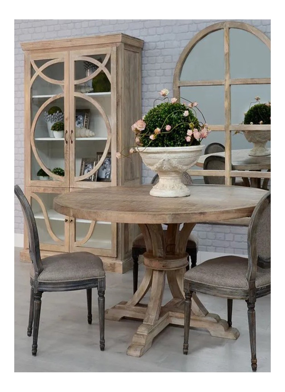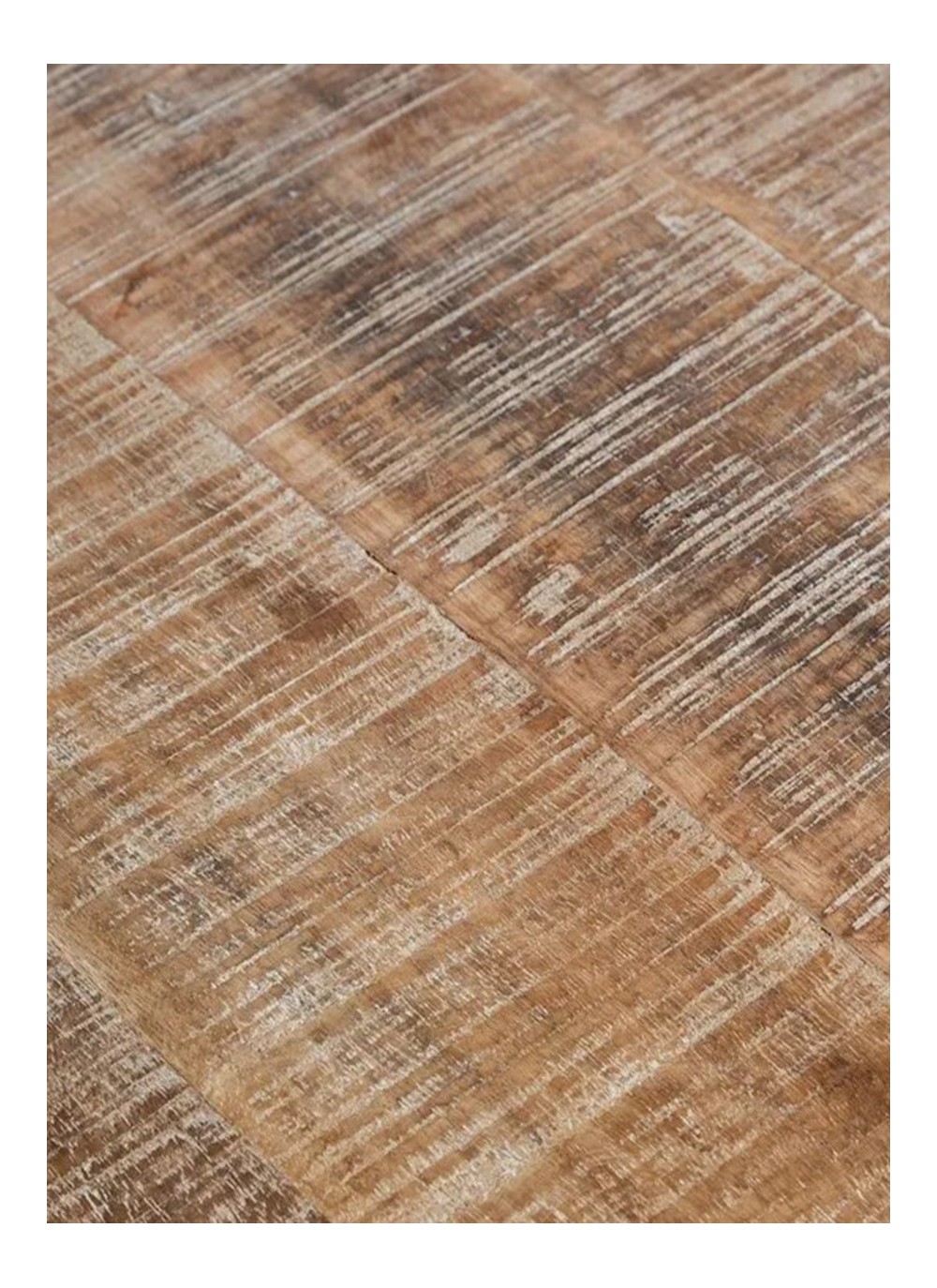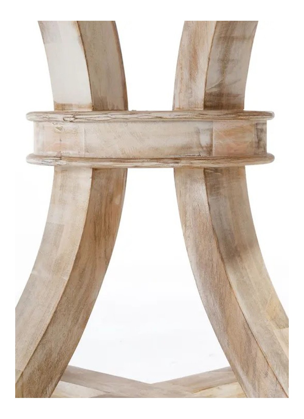 La Mesa Dinamarca presenta un diseño redondo de 150 cm de diámetro y 76 cm de altura, elaborada en madera maciza de mango con acabado decapé blanco, lo que realza sus vetas naturales y aporta un aire fresco y luminoso. Diseñada artesanalmente con listones de madera, su superficie puede mostrar ligeras imperfecciones que refuerzan el carácter manual y exclusivo de cada pieza. Su grosor de tablero asciende a 4 cm.