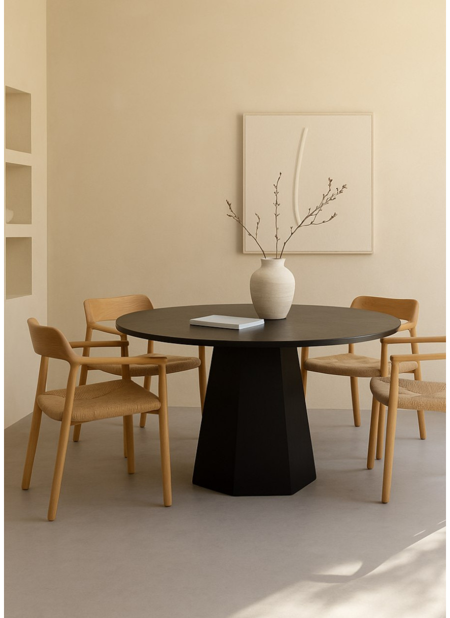 Esta mesa de diseño cuenta con una estructura de madera de roble, destacando por su elegante y natural pata central.