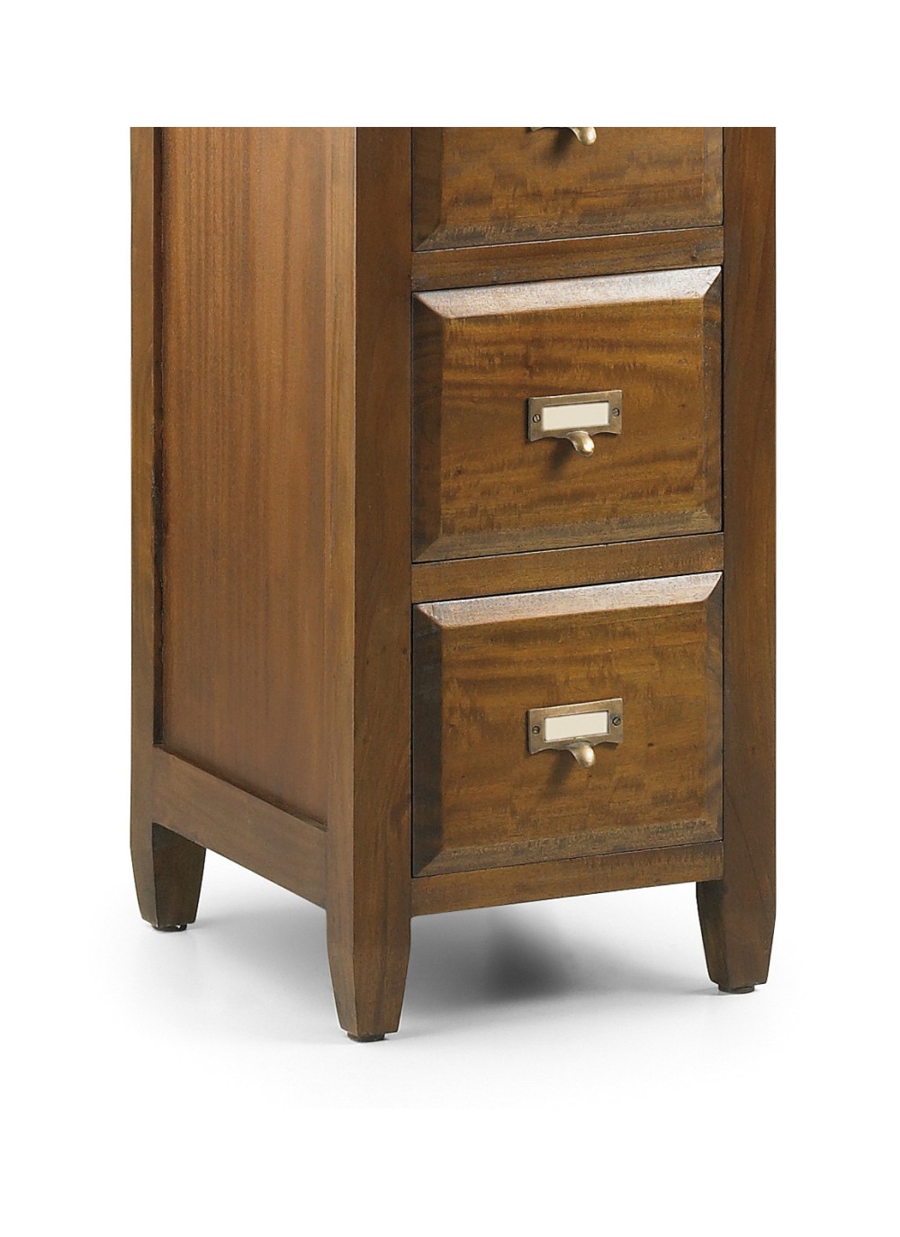 Mesita de noche de estilo rústico realizado con madera de caoba y accesorios de bronce, compuesta por tres cajones. Disponible otras piezas de la misma colección. Fabricación realizada a mano.