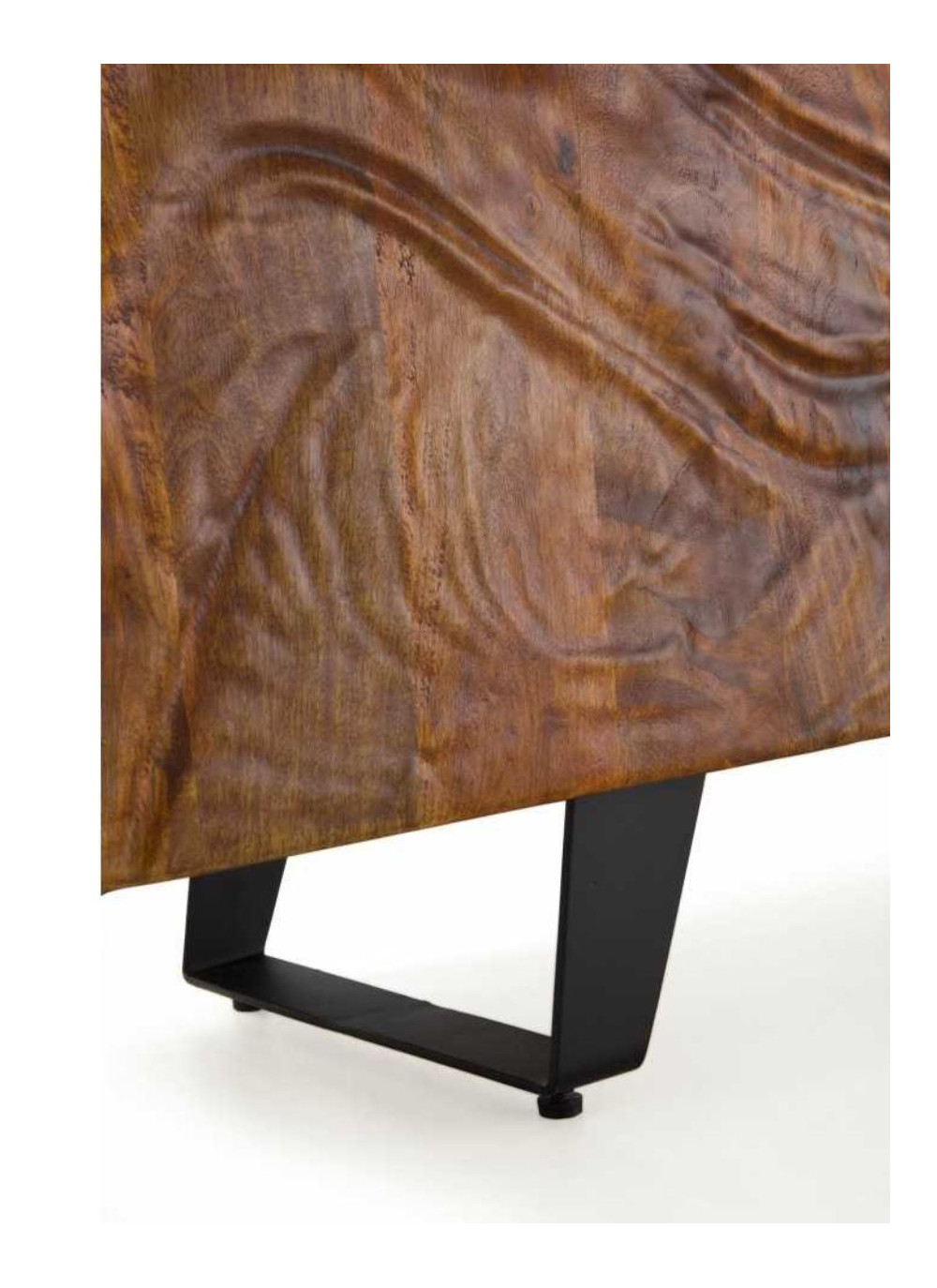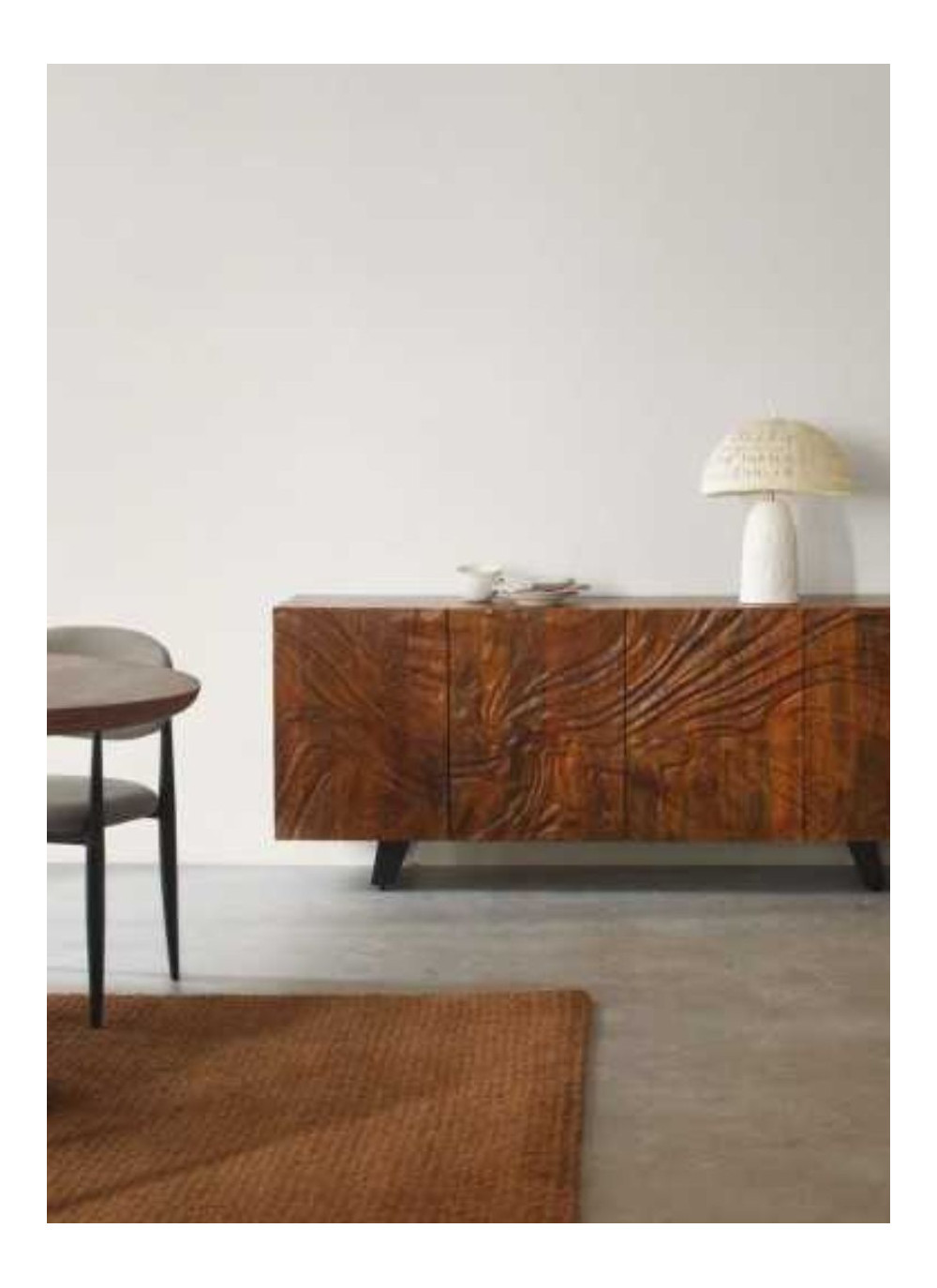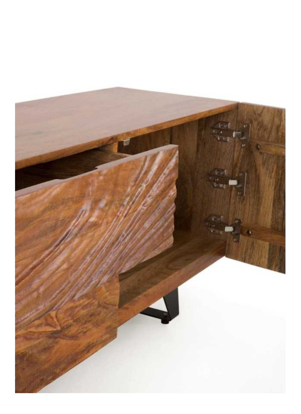 Mueble de tv de diseño moderno fabricado en madera maciza de mango, ideal para salones de estilo contemporáneo, industrial o japandi. Su frente texturizado con relieve que realza la veta natural y convierte cada pieza en un elemento decorativo único. Incorpora dos puertas con bisagras de cierre suave e imán para un cierre seguro, sin estantes interiores, y dos amplios cajones con guías de madera (medidas interiores: 54 × 30 × 13 cm), perfectos para el almacenamiento del día a día.