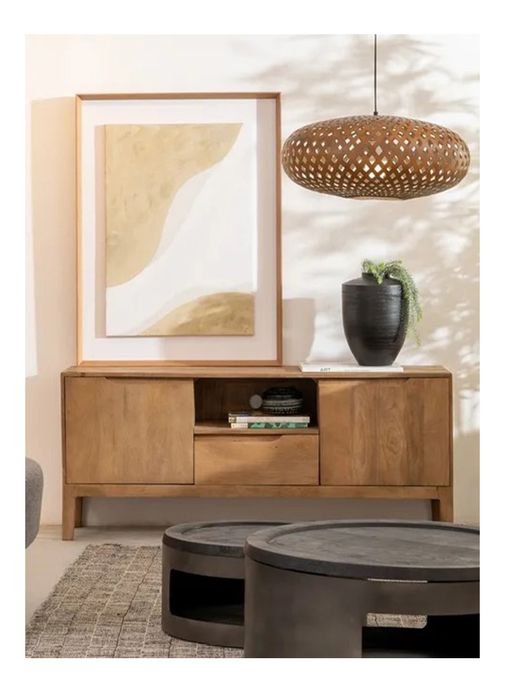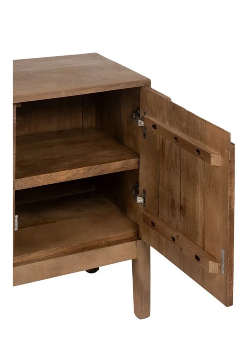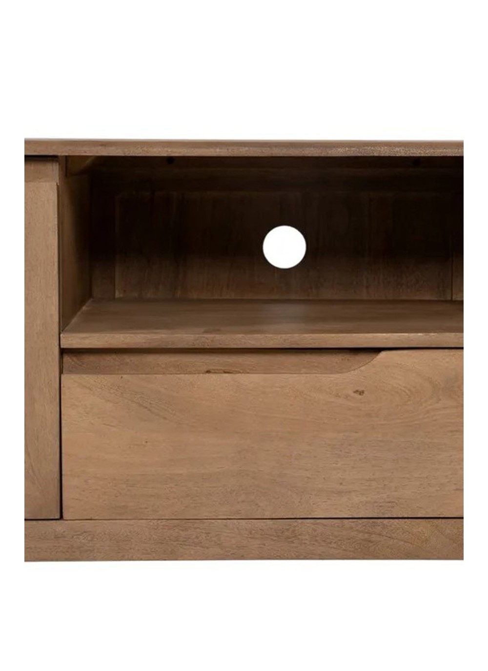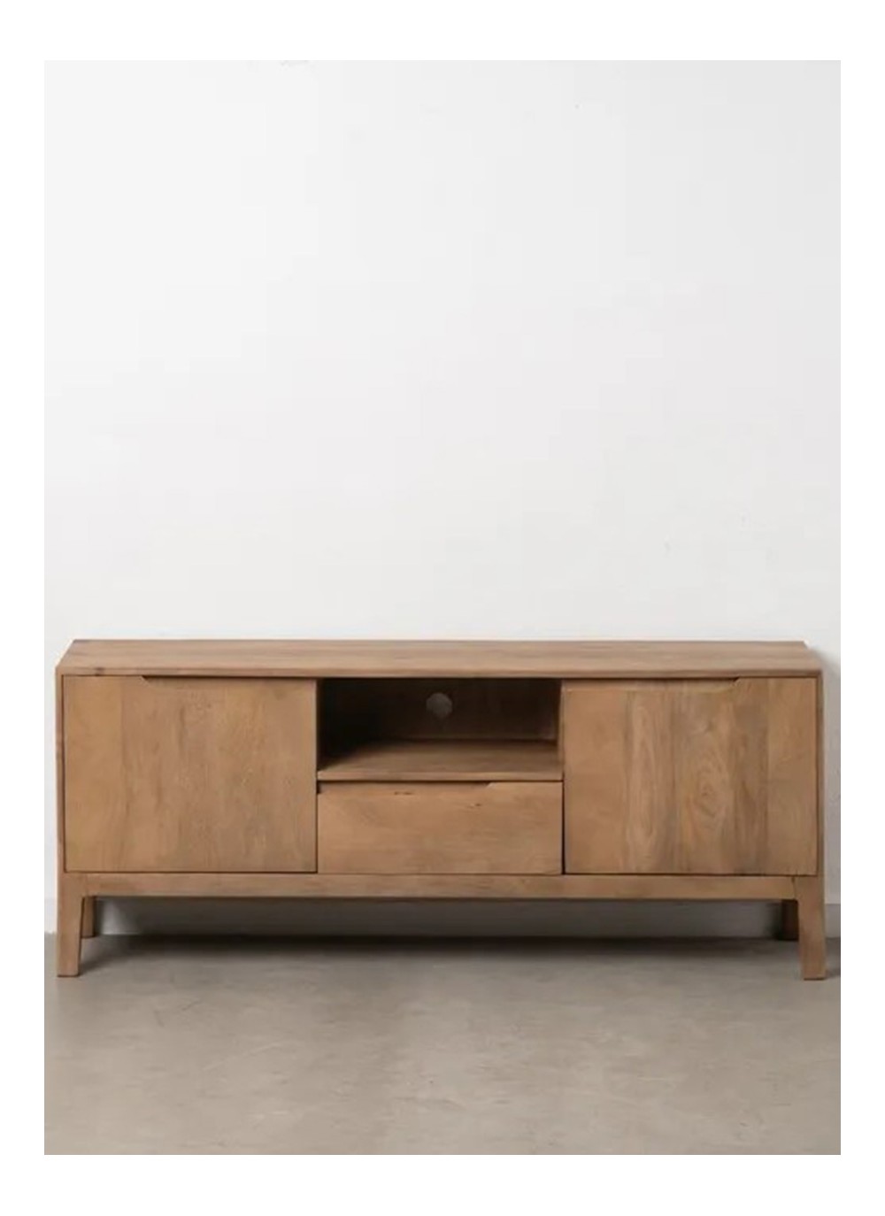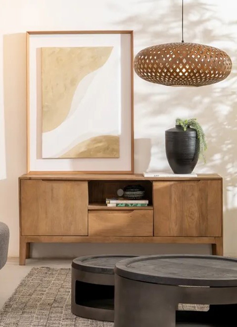 Este mueble TV, está elaborado con madera de mango natural que realza vetas cálidas y tonos dorado-miel, aportando un carácter orgánico y acogedor al hogar. Con dimensiones de 150 cm de ancho × 40 cm de fondo × 60 cm de alto, ofrece equilibrio visual y gran presencia funcional.