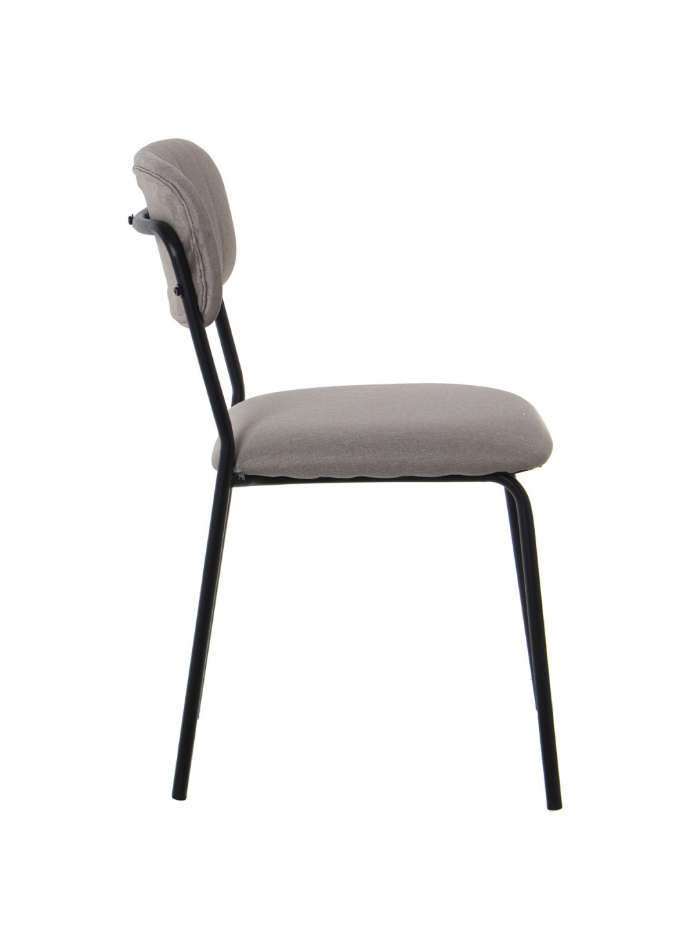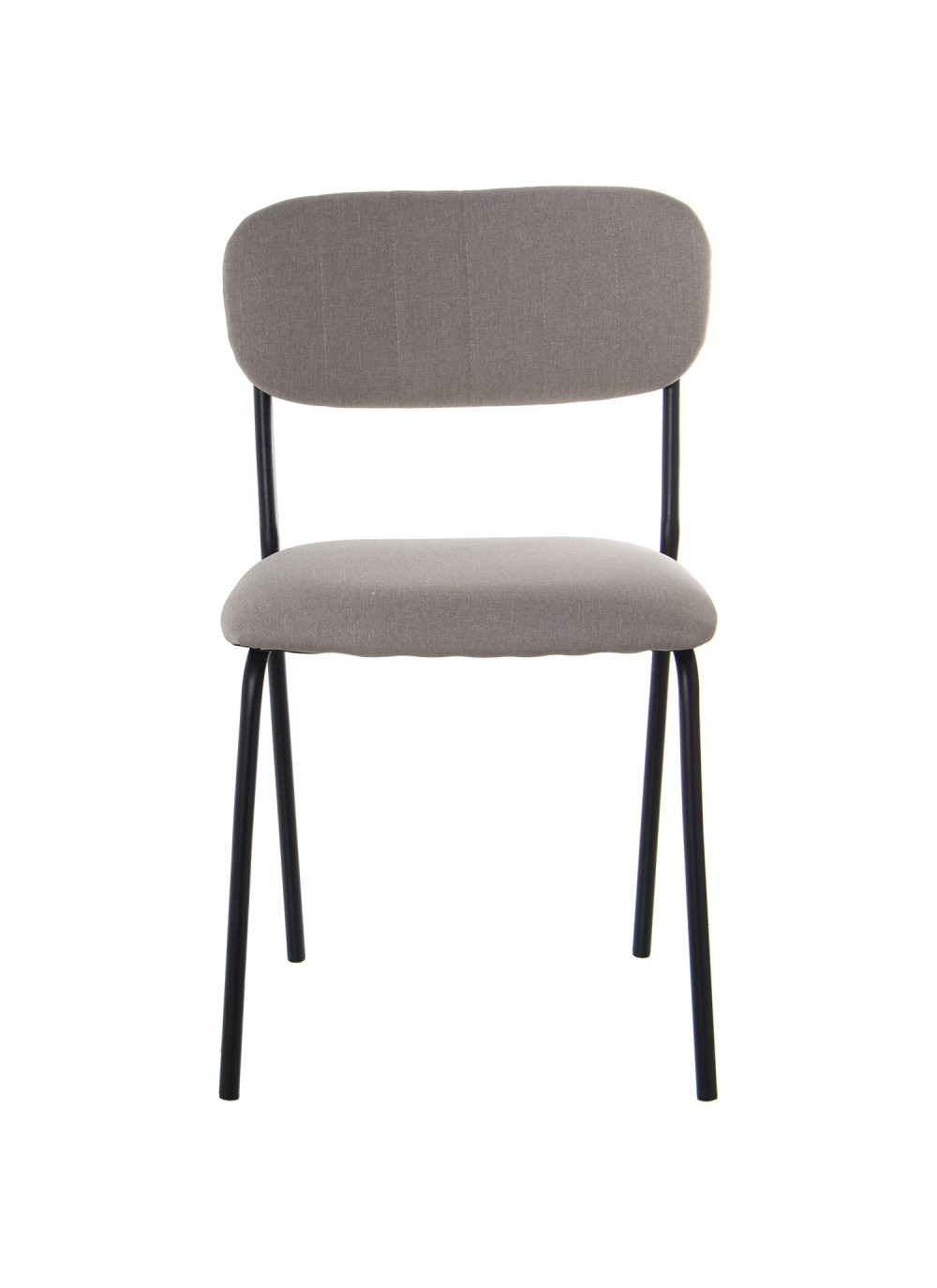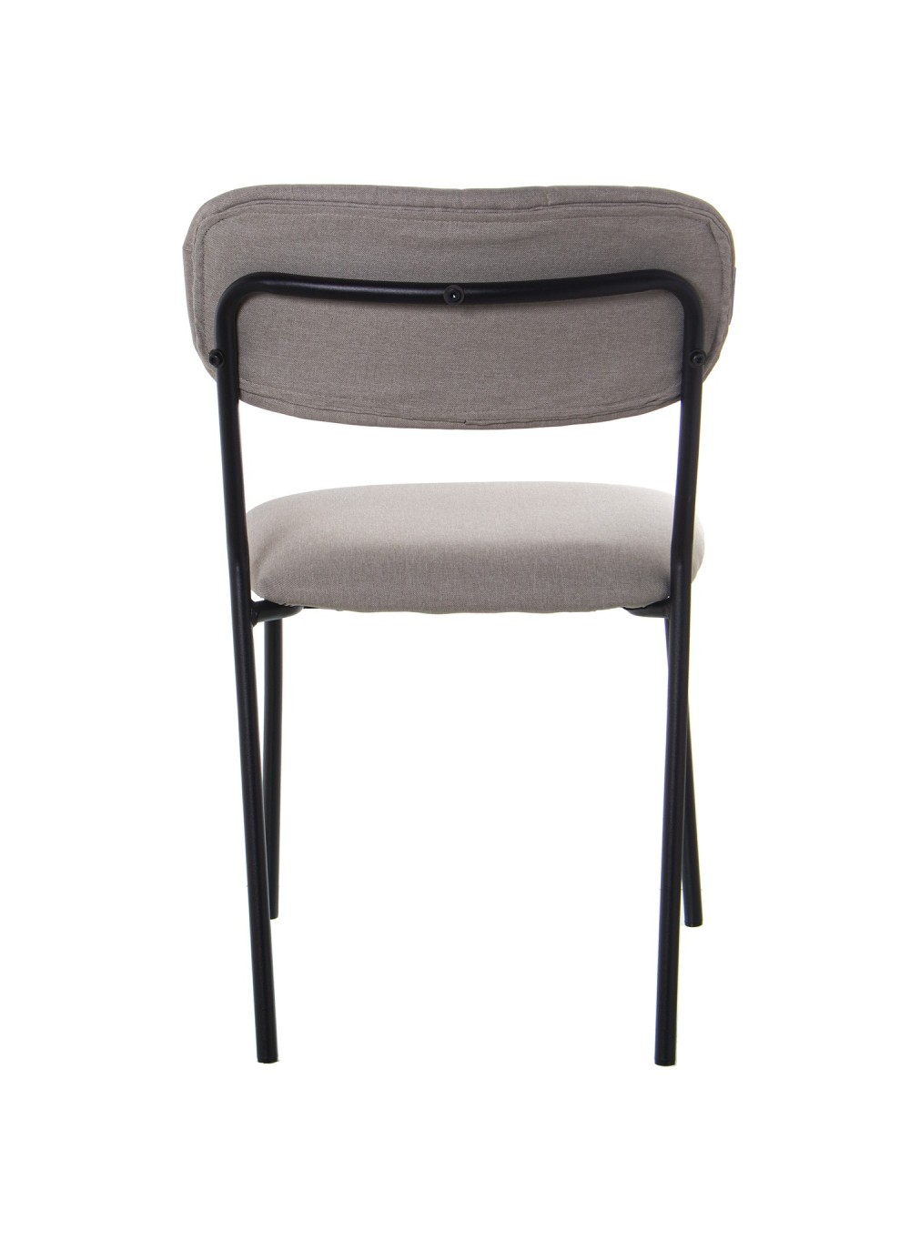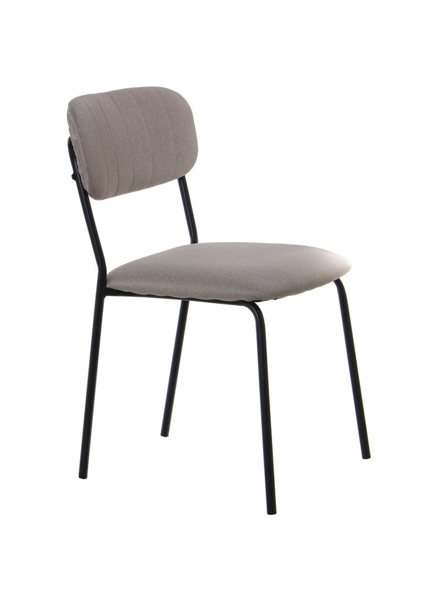 Set de cuatro sillas tapizado beige con patas de metal negro.