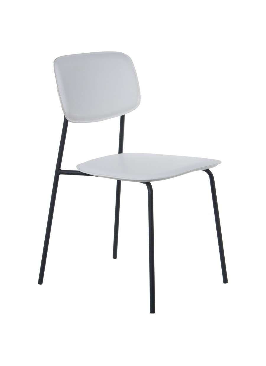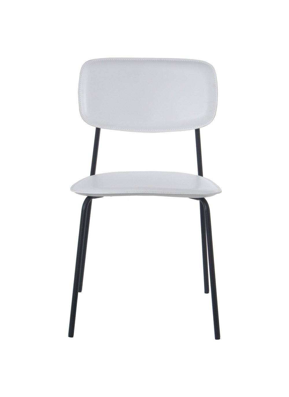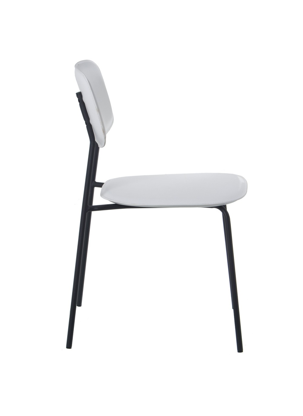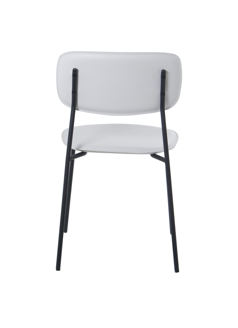 Set de cuatro sillas pu color blanco con patas de metal negras.