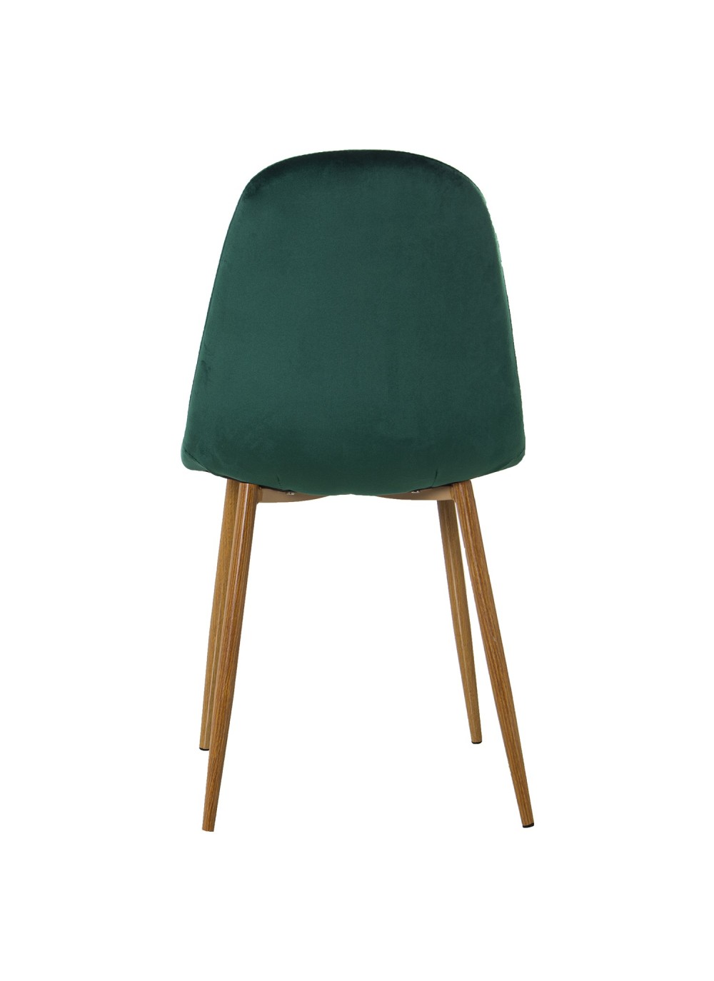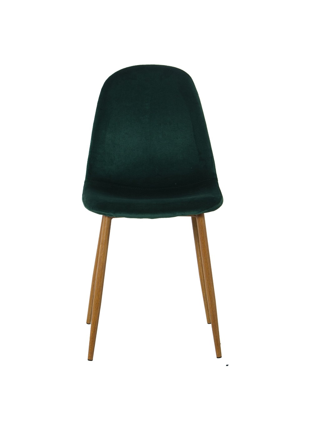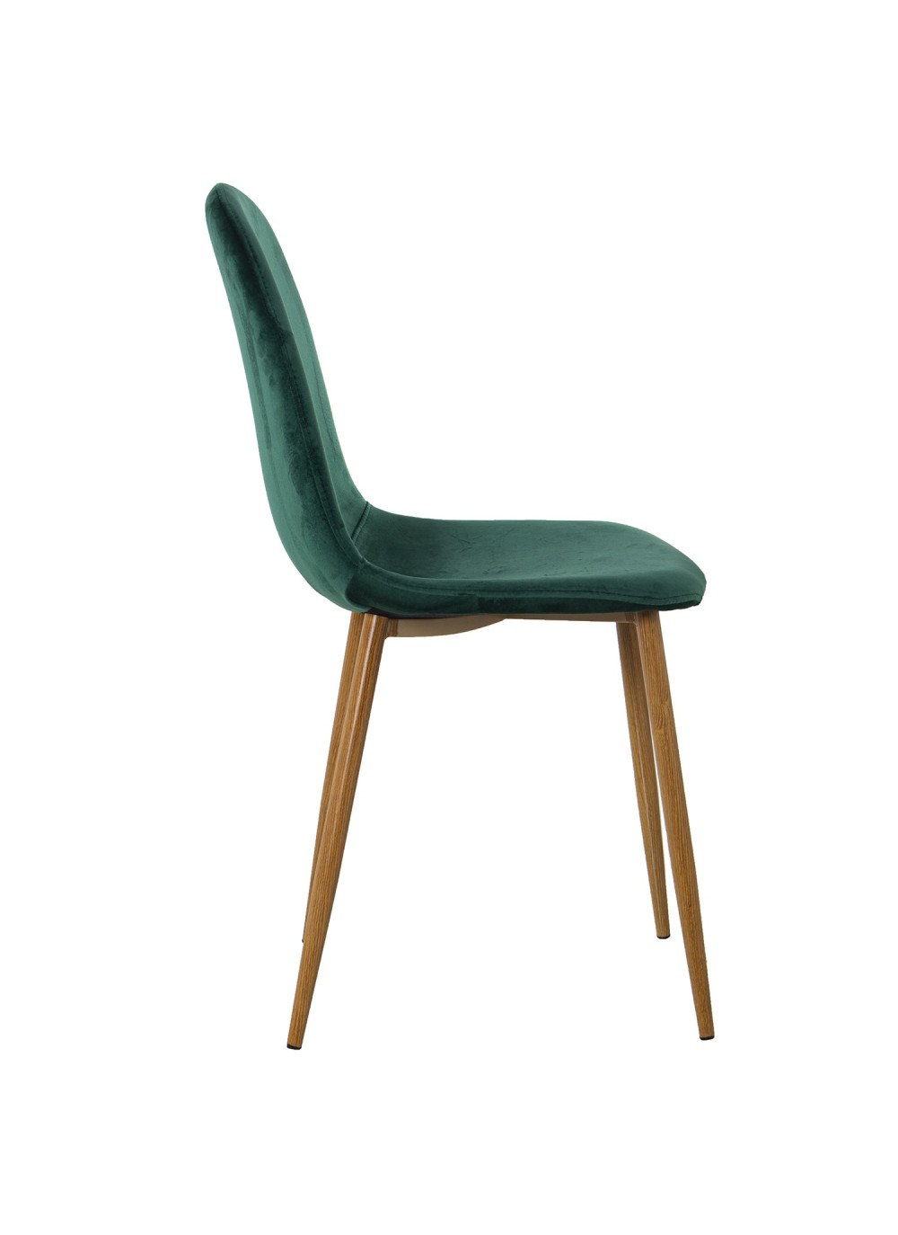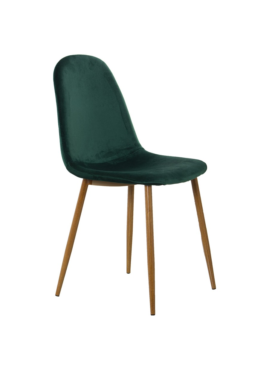 Set de cuatro sillas de terciopelo verde oscuro con patas de metal imitación madera.