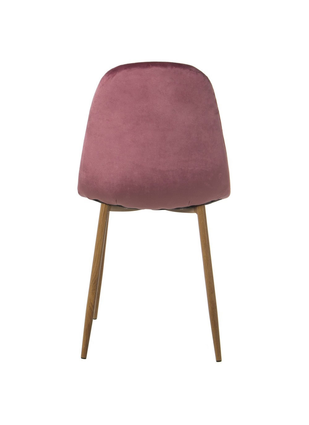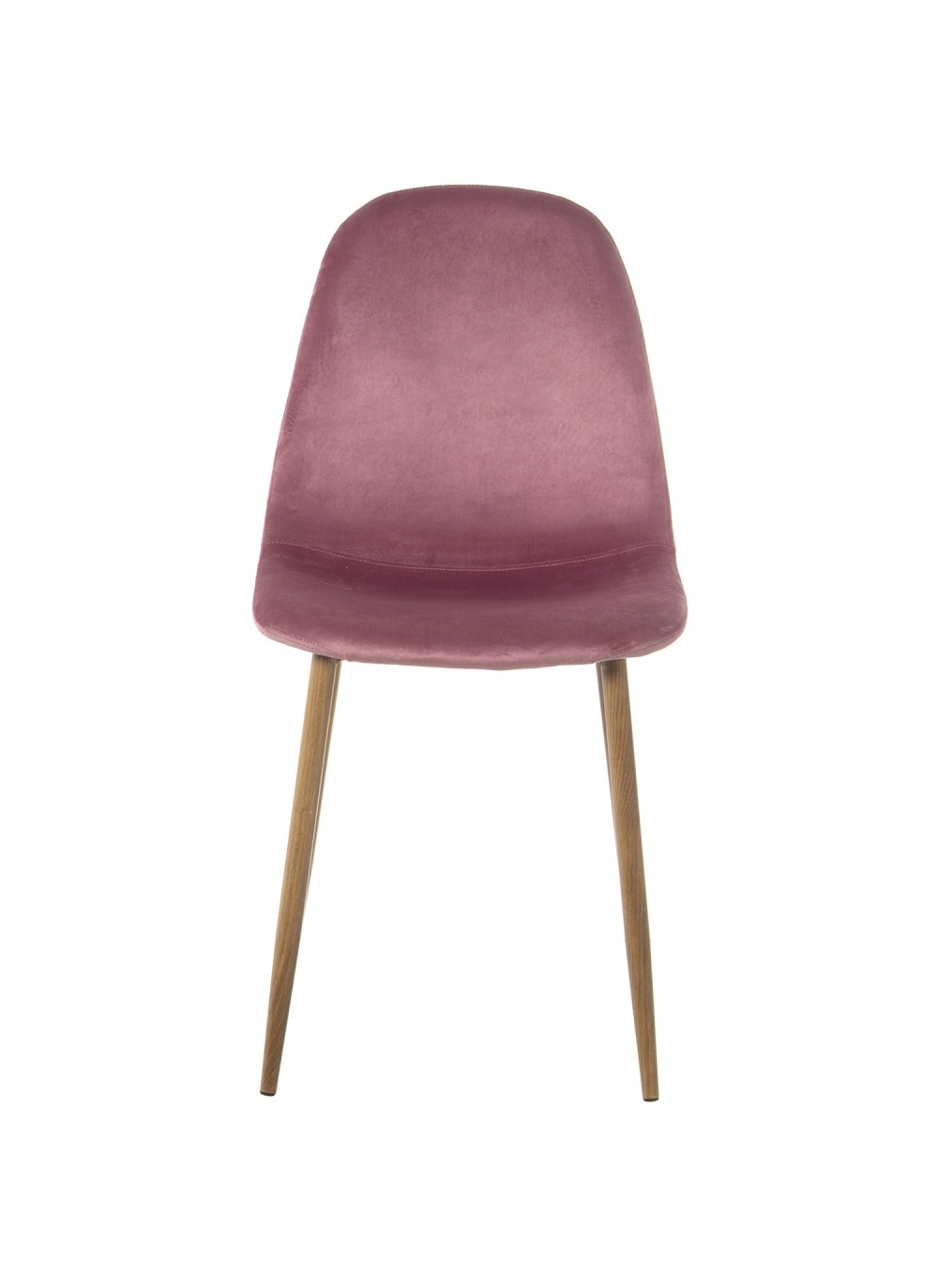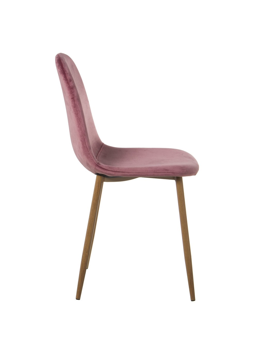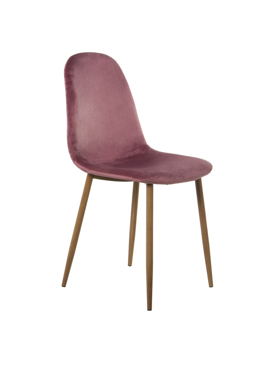 Set de cuatro sillas de terciopelo rosa con patas de metal imitación madera.
