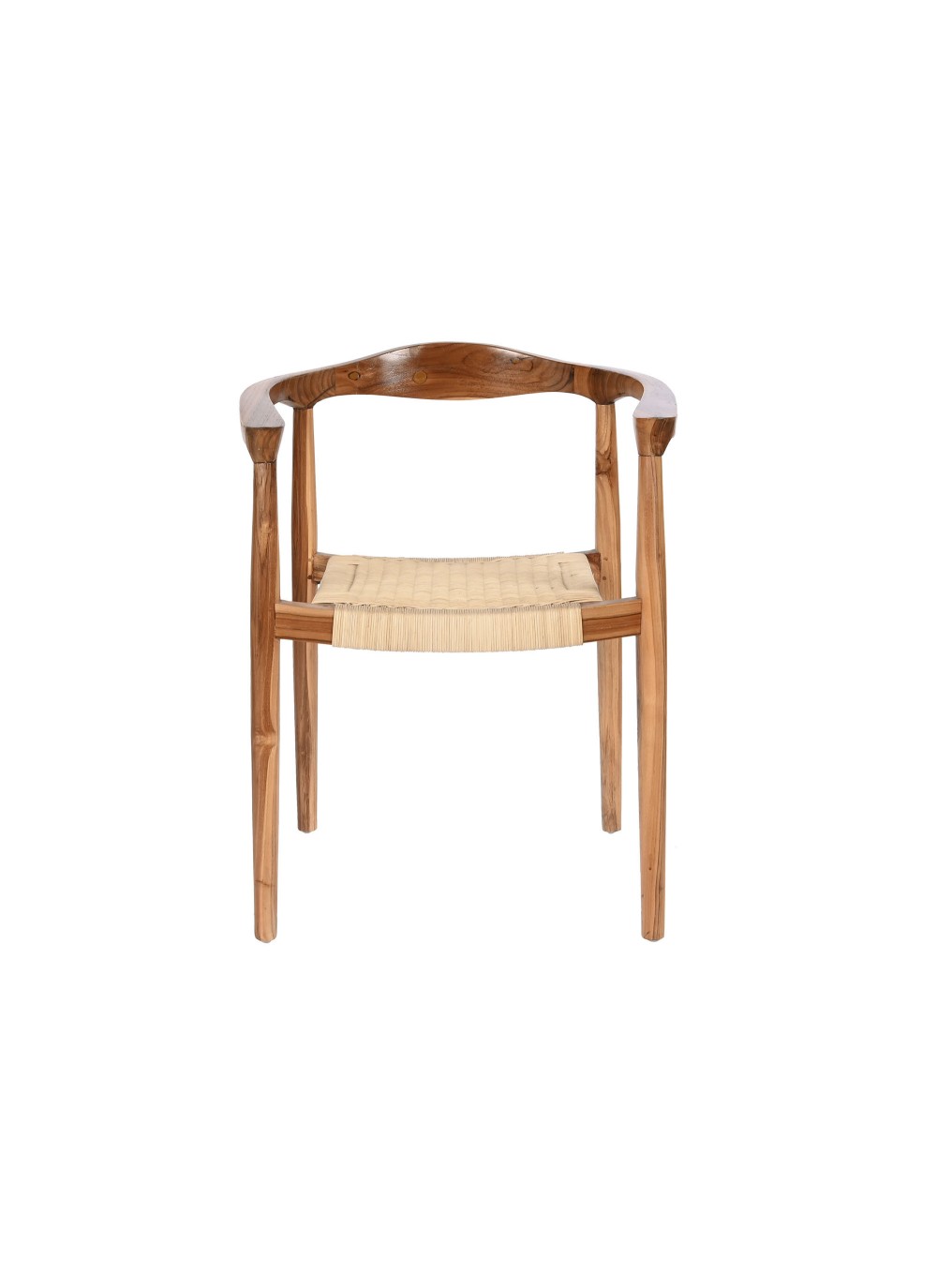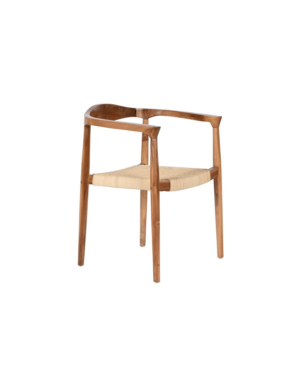 El respaldo y asiento de ratán ofrecen una comodidad ergonómica, mientras que la madera de teca, resistente y con un tono cálido, asegura durabilidad y estabilidad con el paso del tiempo.