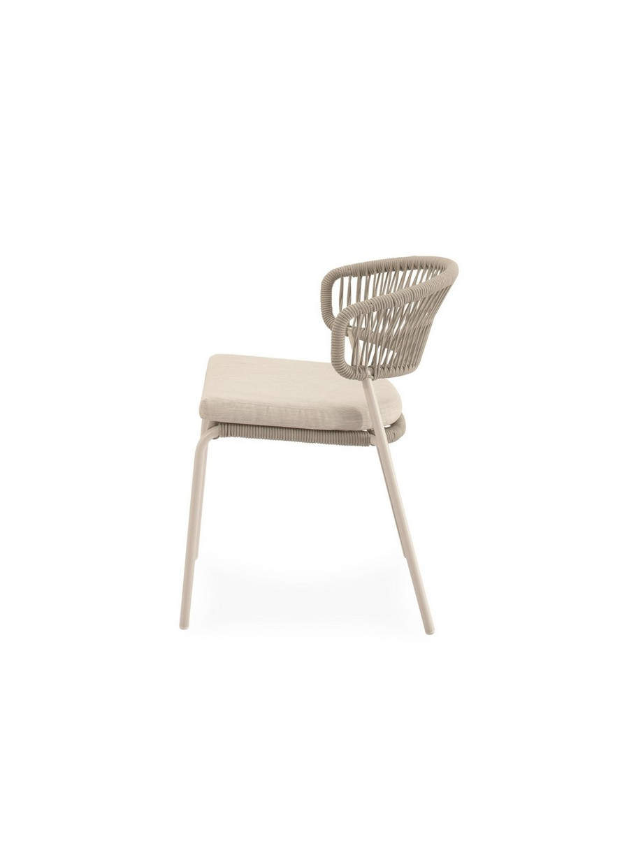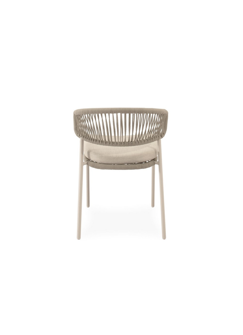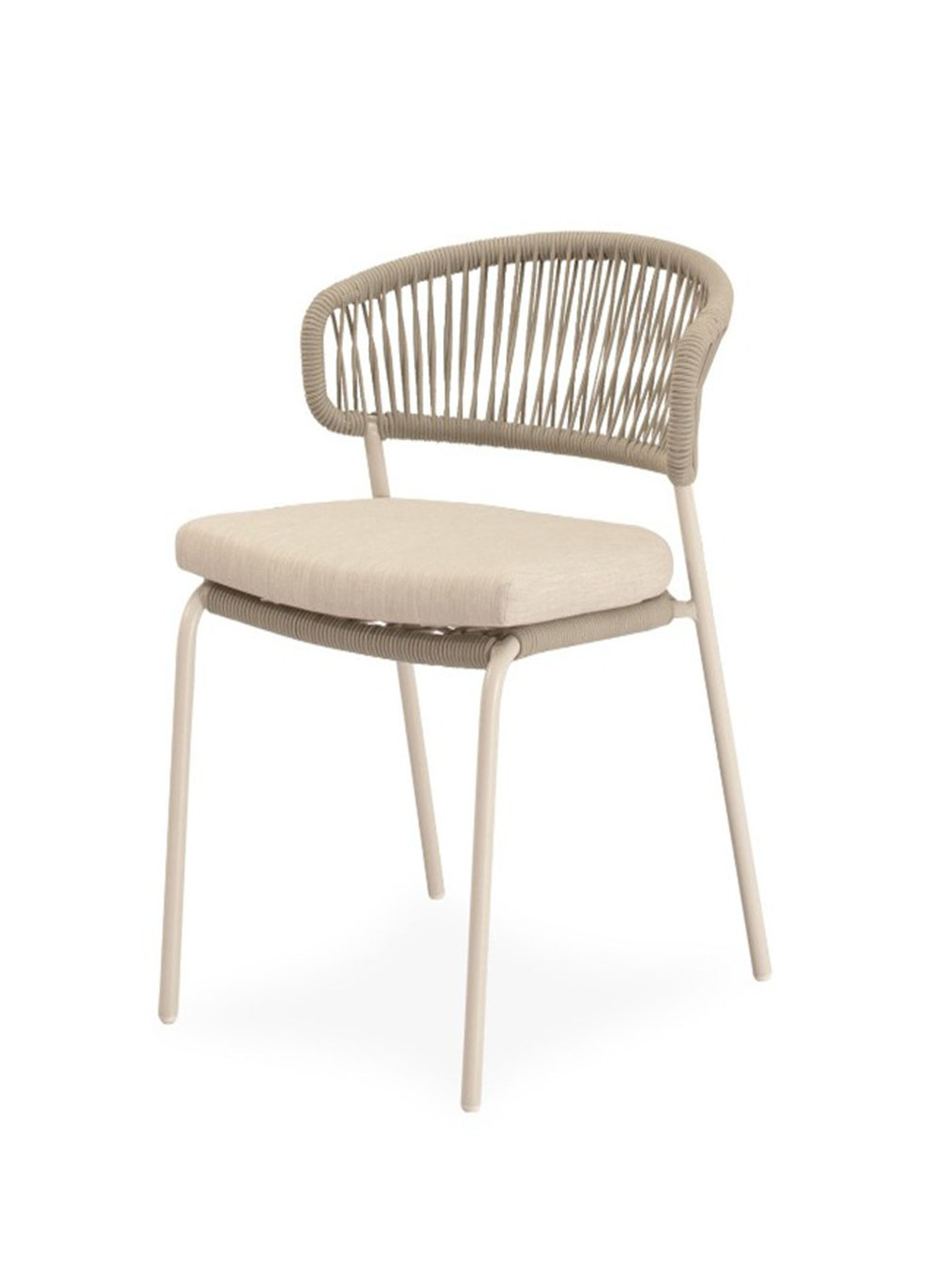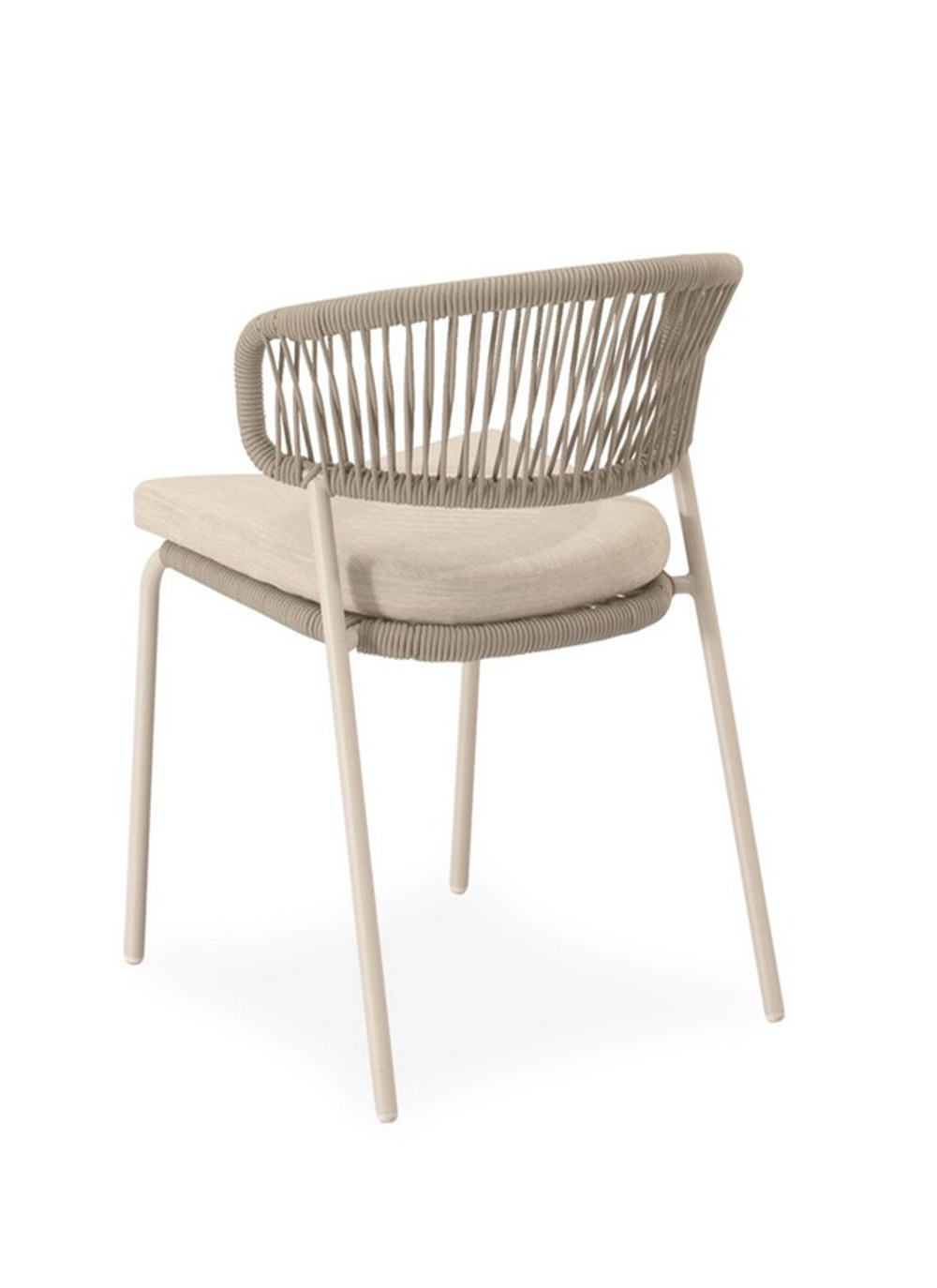 Su estructura de cuerda resistente y patas de acero perfeccionado para resistir al entorno exterior, ofrecen un equilibrio perfecto entre estabilidad y estilo, mientras que el asiento acolchado en poliéster proporciona un confort duradero. El respaldo curvo, además de sumar un toque decorativo discreto, favorece una postura cómoda y natural.