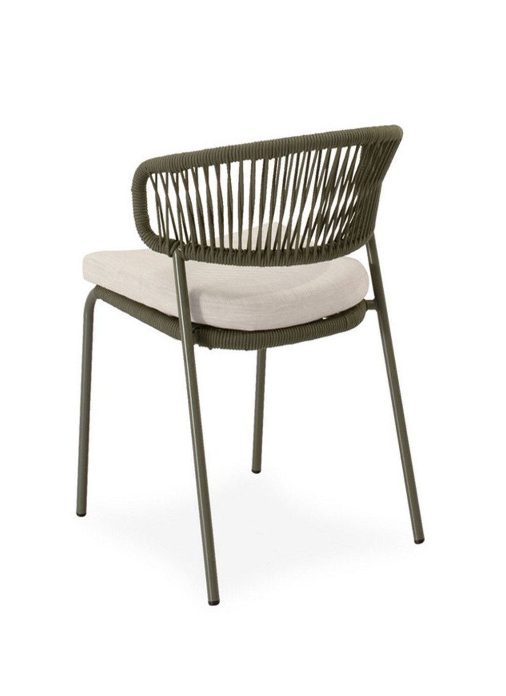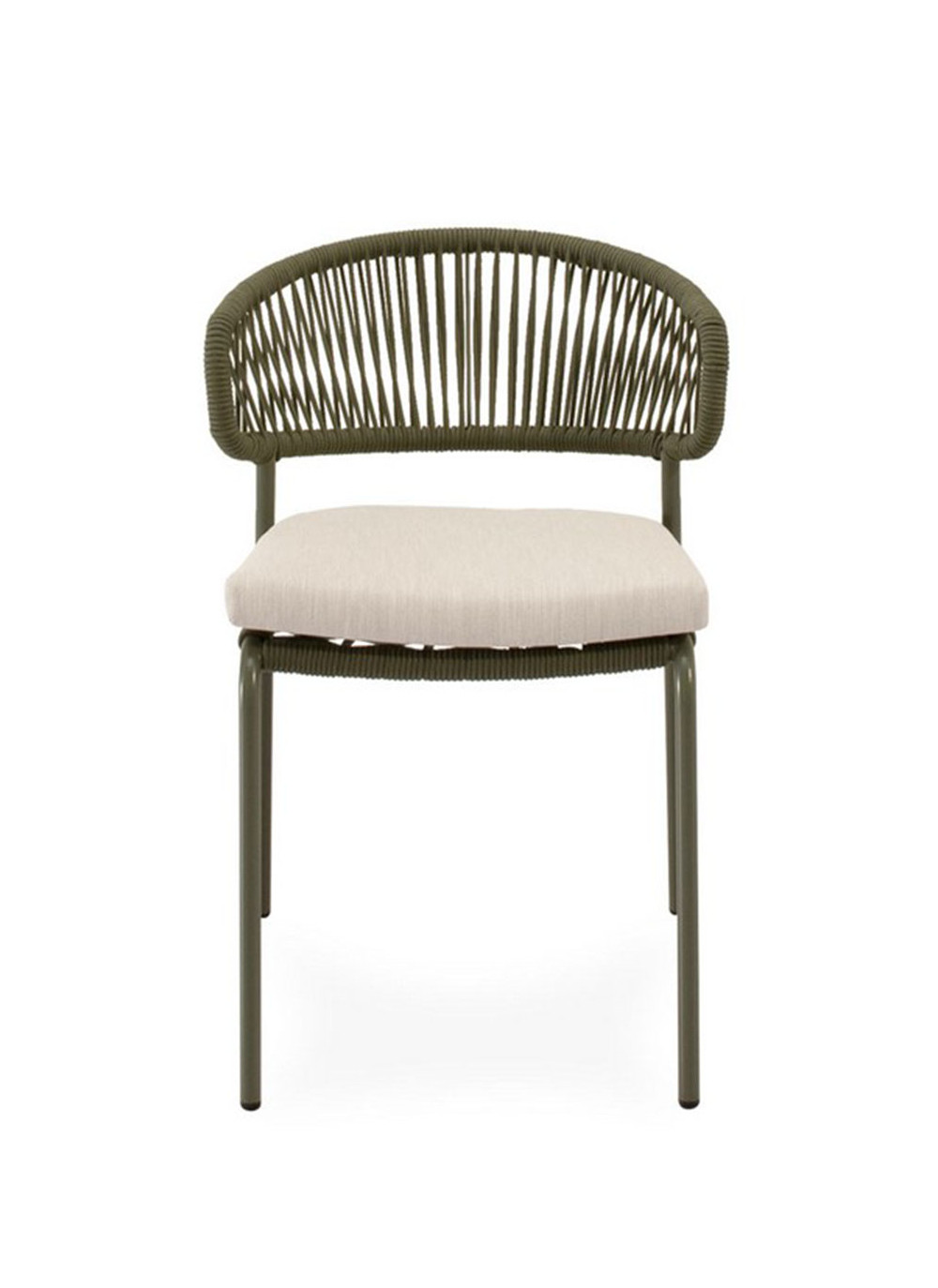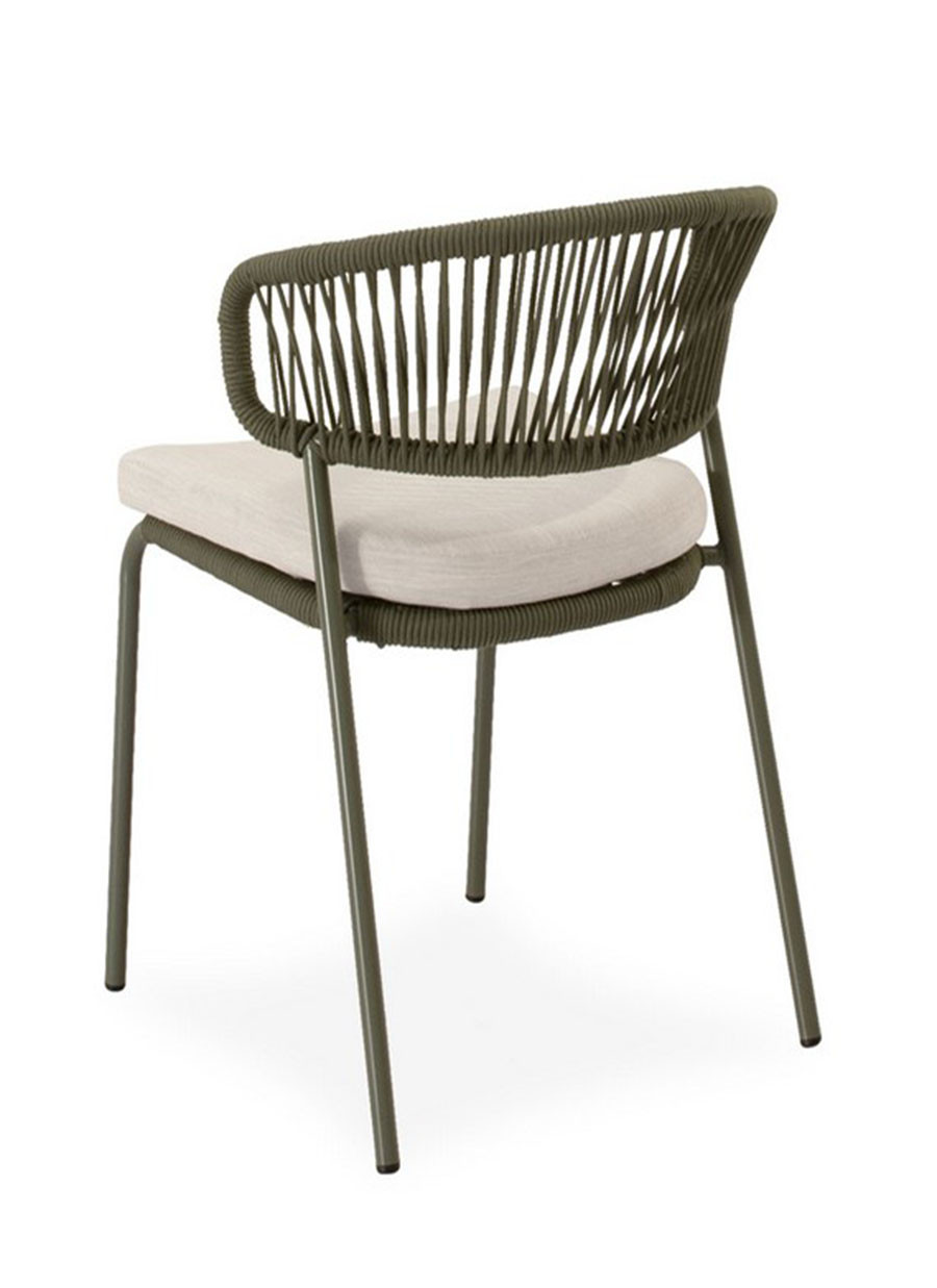 Su estructura de cuerda resistente y patas de acero perfeccionado para resistir al entorno exterior, ofrecen un equilibrio perfecto entre estabilidad y estilo, mientras que el asiento acolchado en poliéster proporciona un confort duradero. El respaldo curvo, además de sumar un toque decorativo discreto, favorece una postura cómoda y natural.