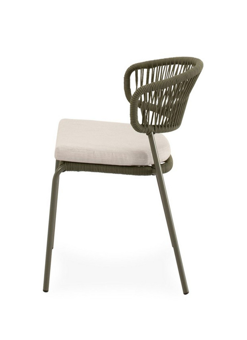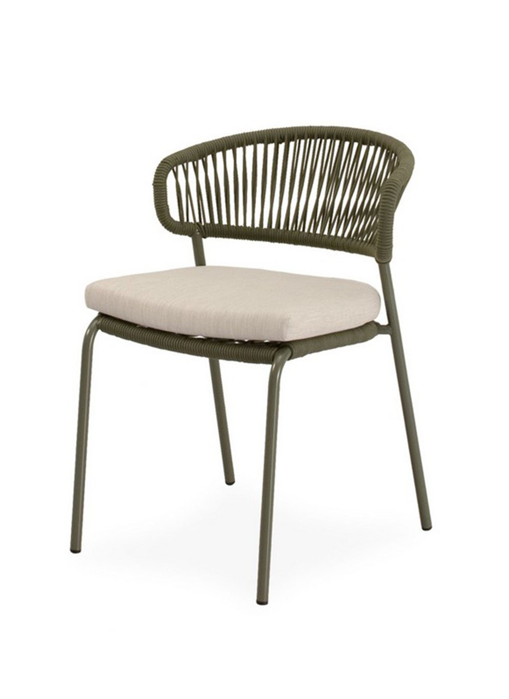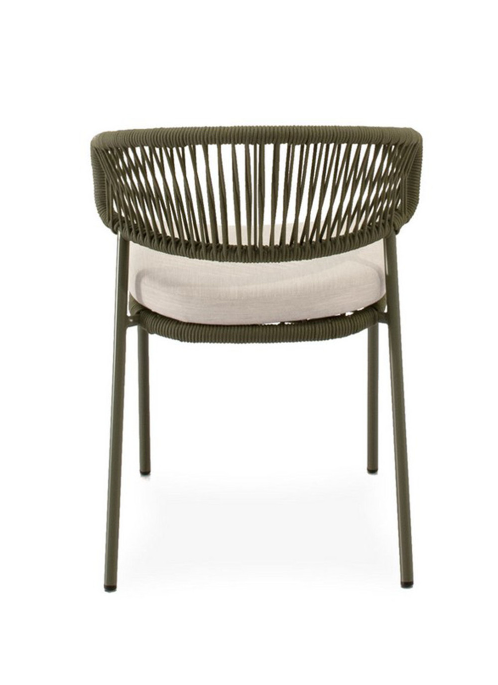 Su estructura de cuerda resistente y patas de acero perfeccionado para resistir al entorno exterior, ofrecen un equilibrio perfecto entre estabilidad y estilo, mientras que el asiento acolchado en poliéster proporciona un confort duradero. El respaldo curvo, además de sumar un toque decorativo discreto, favorece una postura cómoda y natural.