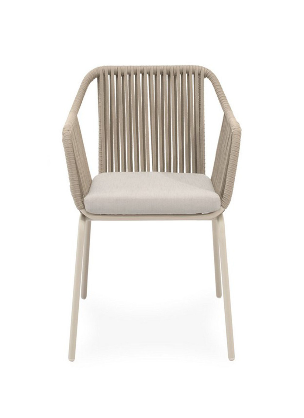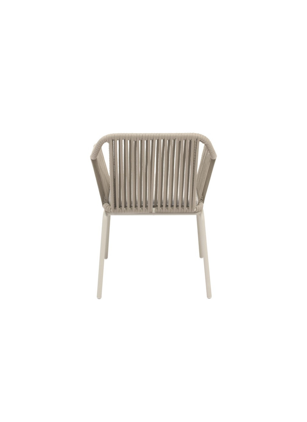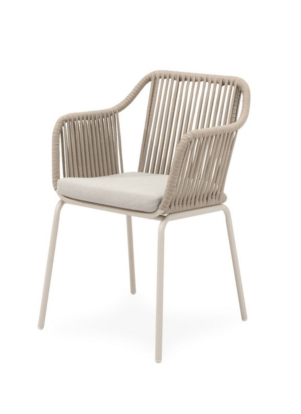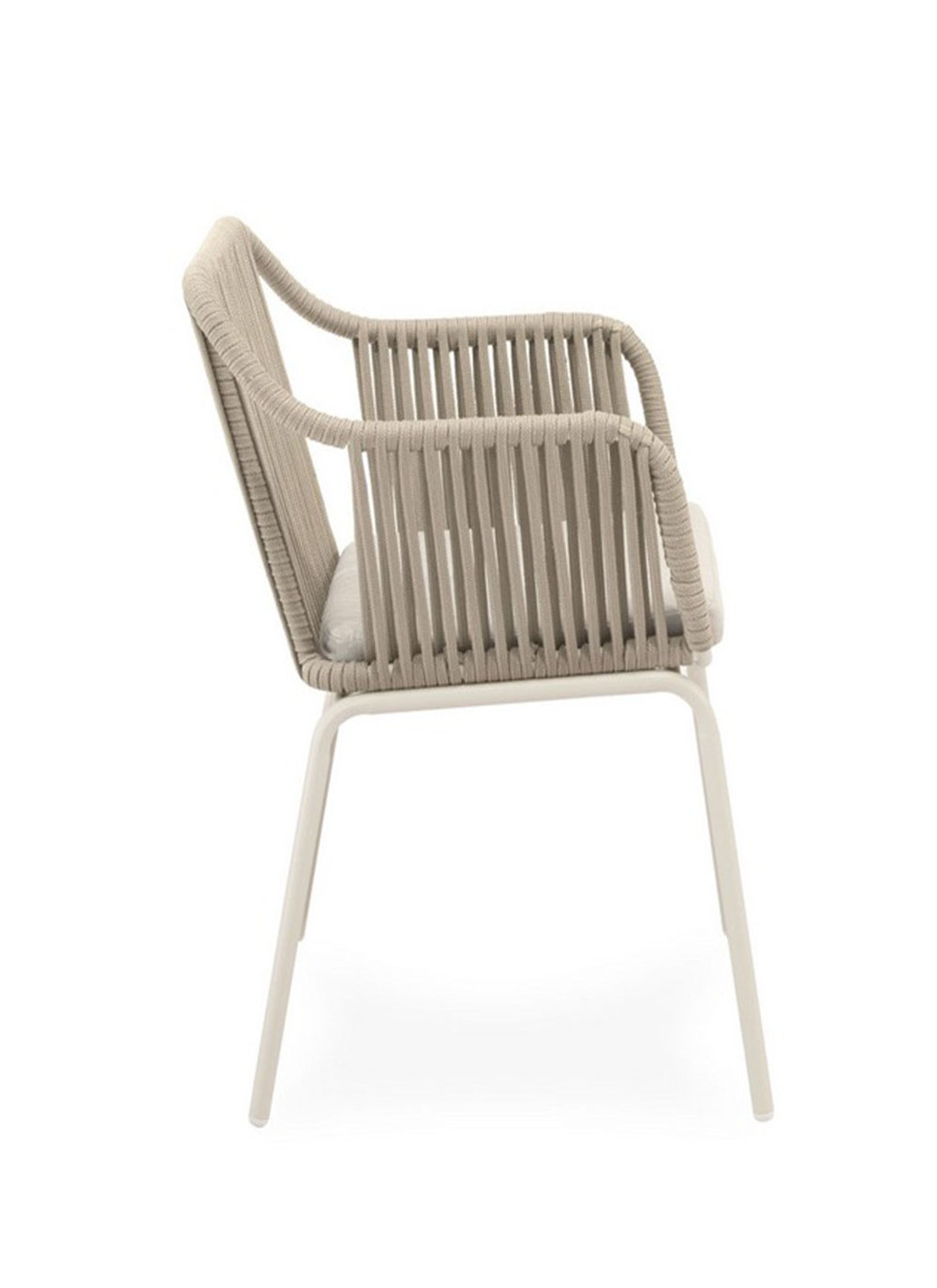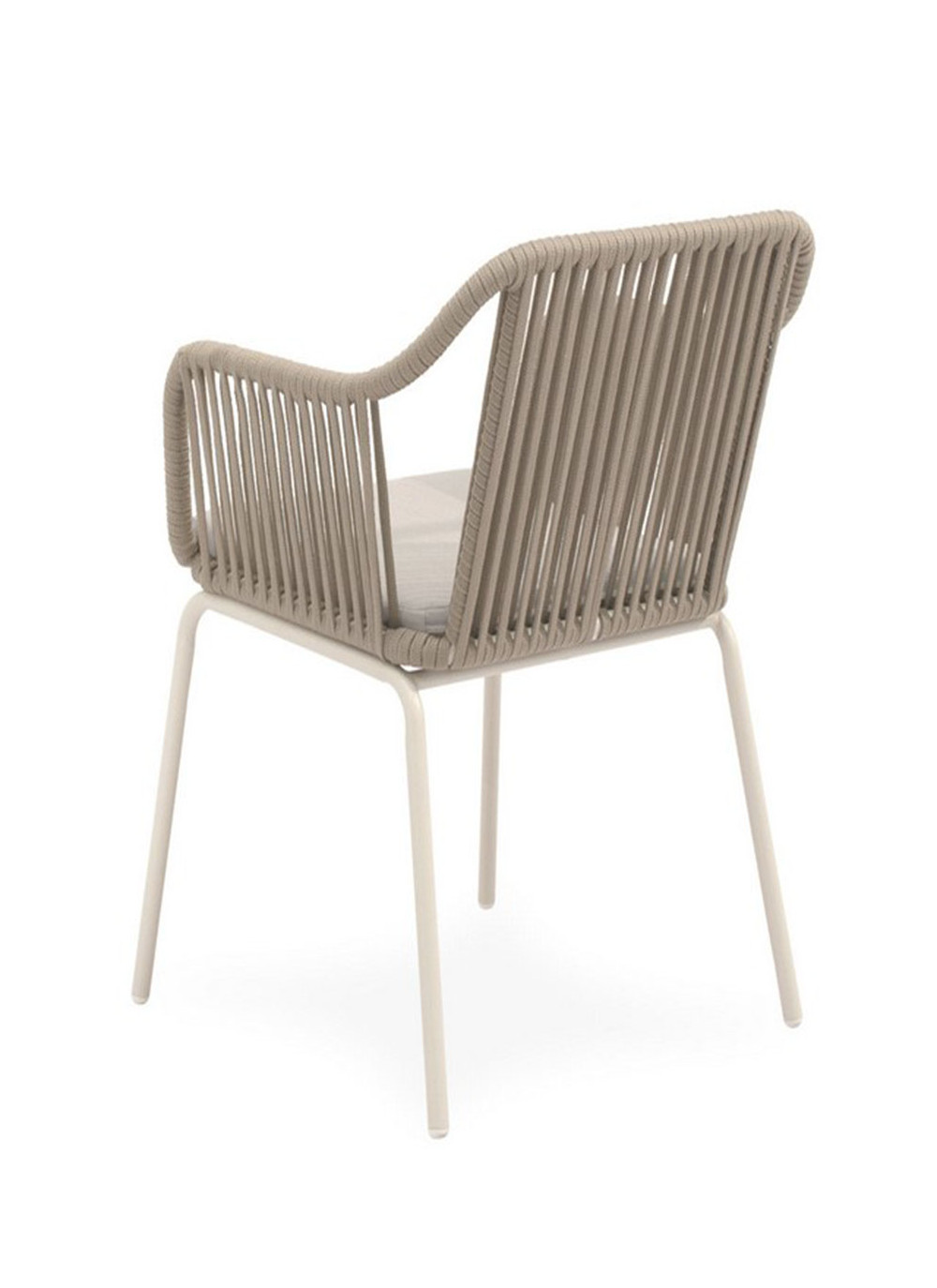 La silla Swann redefine la comodidad con un diseño que envuelve suavemente al usuario. Su respaldo y reposabrazos presentan una estructura compuesta por líneas verticales de cuerda que se curvan de manera orgánica, creando un efecto visual atractivo y proporcionando un soporte firme y ergonómico. Este diseño fluido y continuo ofrece un abrazo acogedor que invita a relajarse mientras mantiene una estética moderna y ligera.
