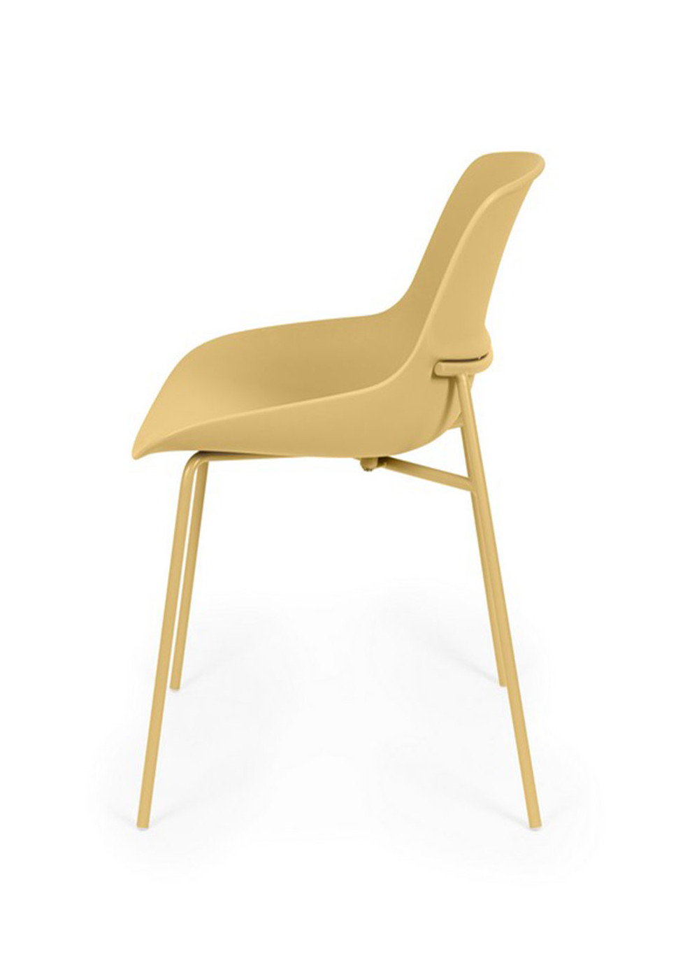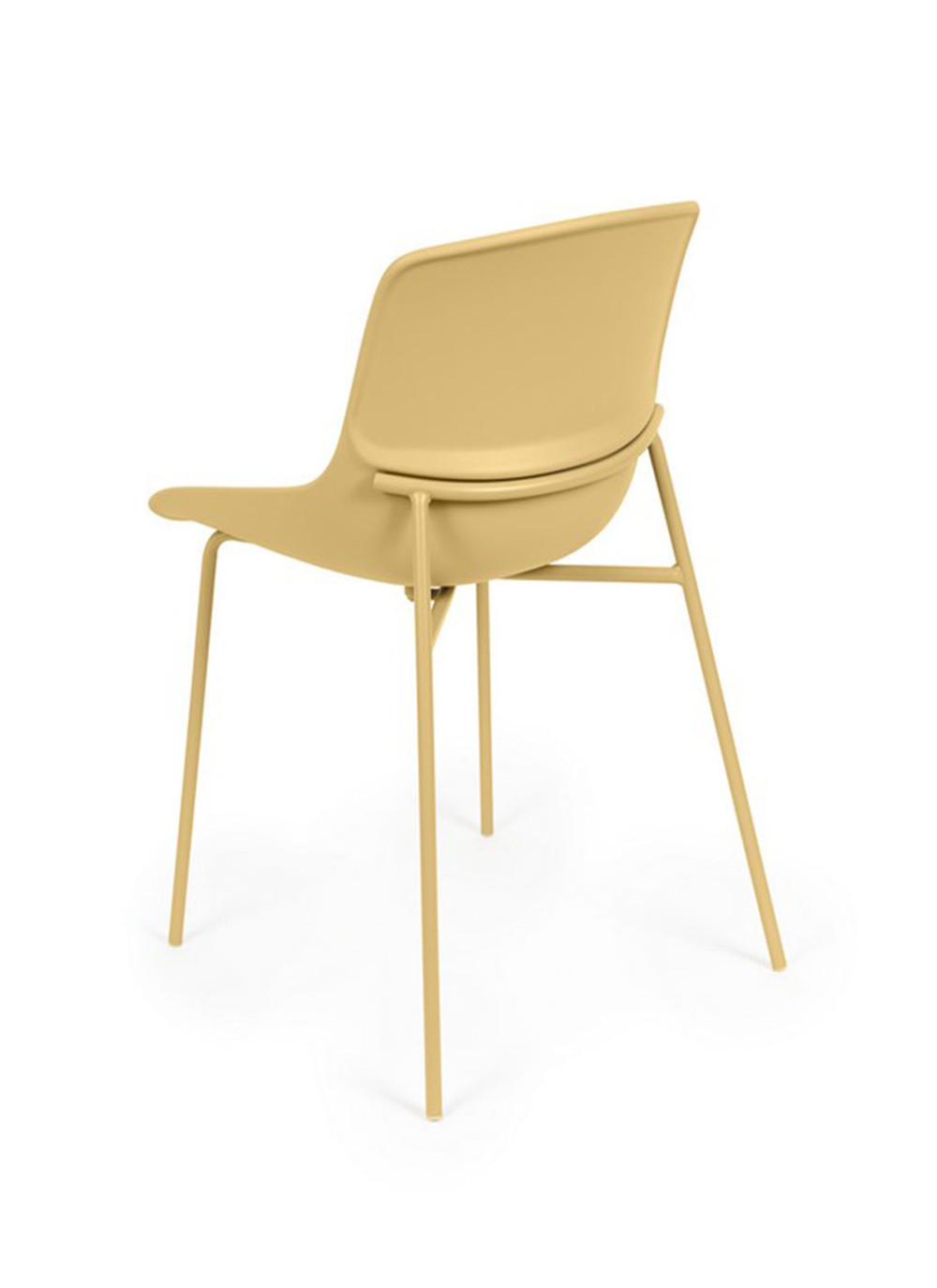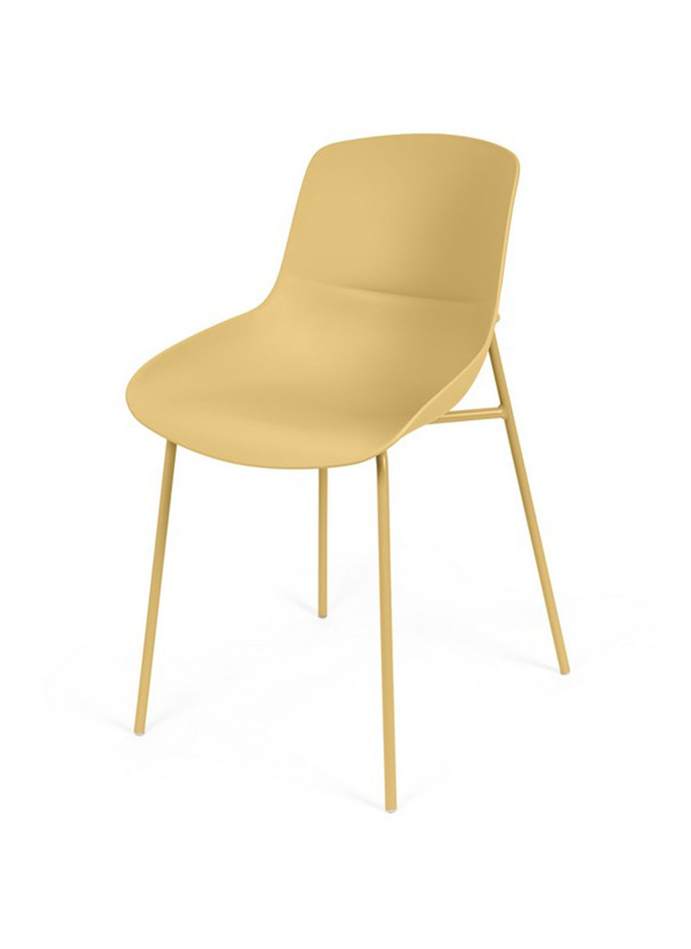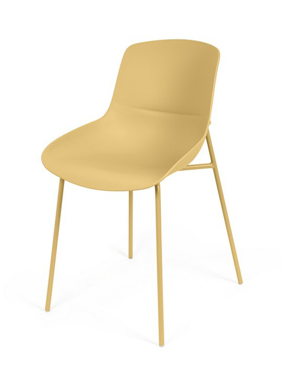 Su asiento de polipropileno, suavemente curvado, abraza el cuerpo con naturalidad mientras que sus patas metálicas, esbeltas y firmes, aportan un aire moderno y funcional.