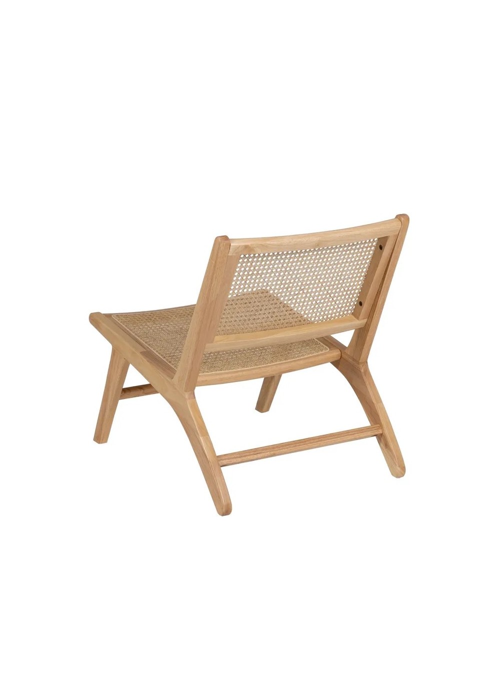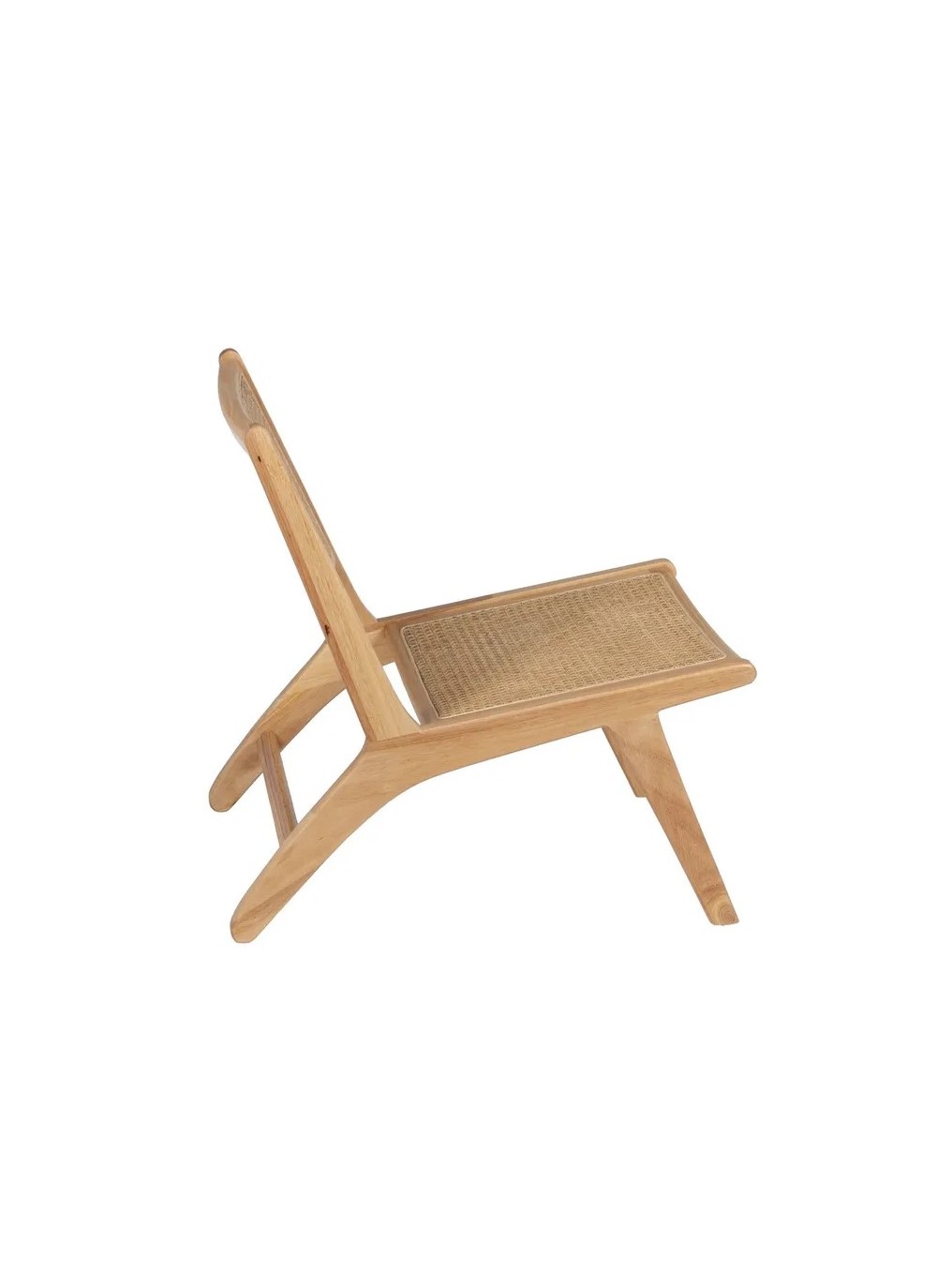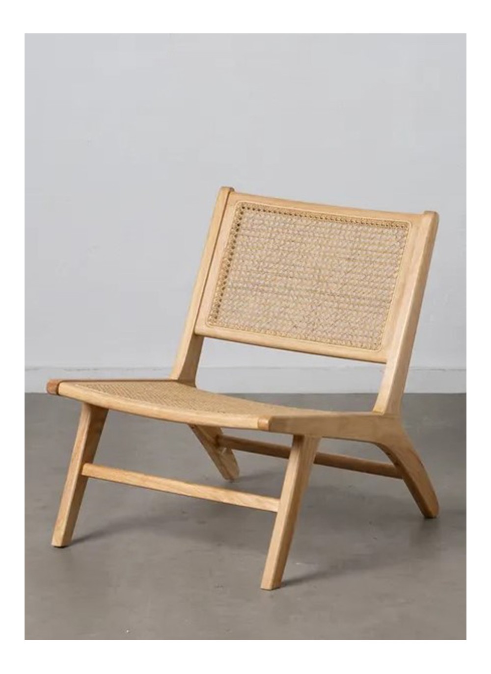 Este sillón presenta una estructura elegante de madera maciza de caucho combinada con un respaldo y asiento tejido en ratán natural, formando un conjunto de estética orgánica y tacto cálido. Sus medidas aproximadas de 60,5 cm de ancho × 73,5 cm de fondo × 72,5 cm de alto lo sitúan en el formato ideal de butaca lounge para zonas de descanso o lectura.
