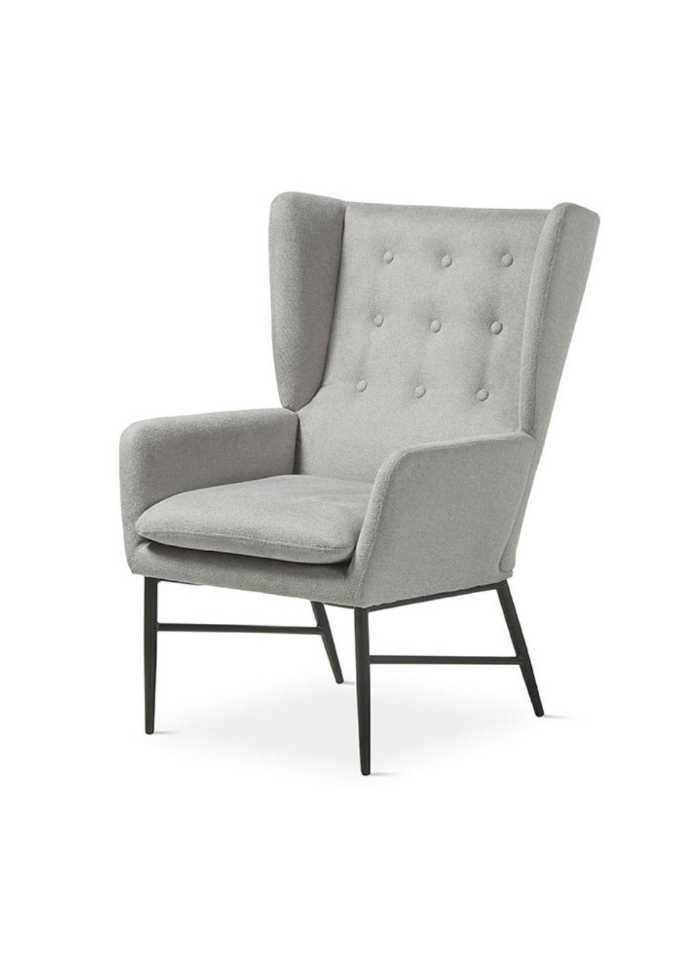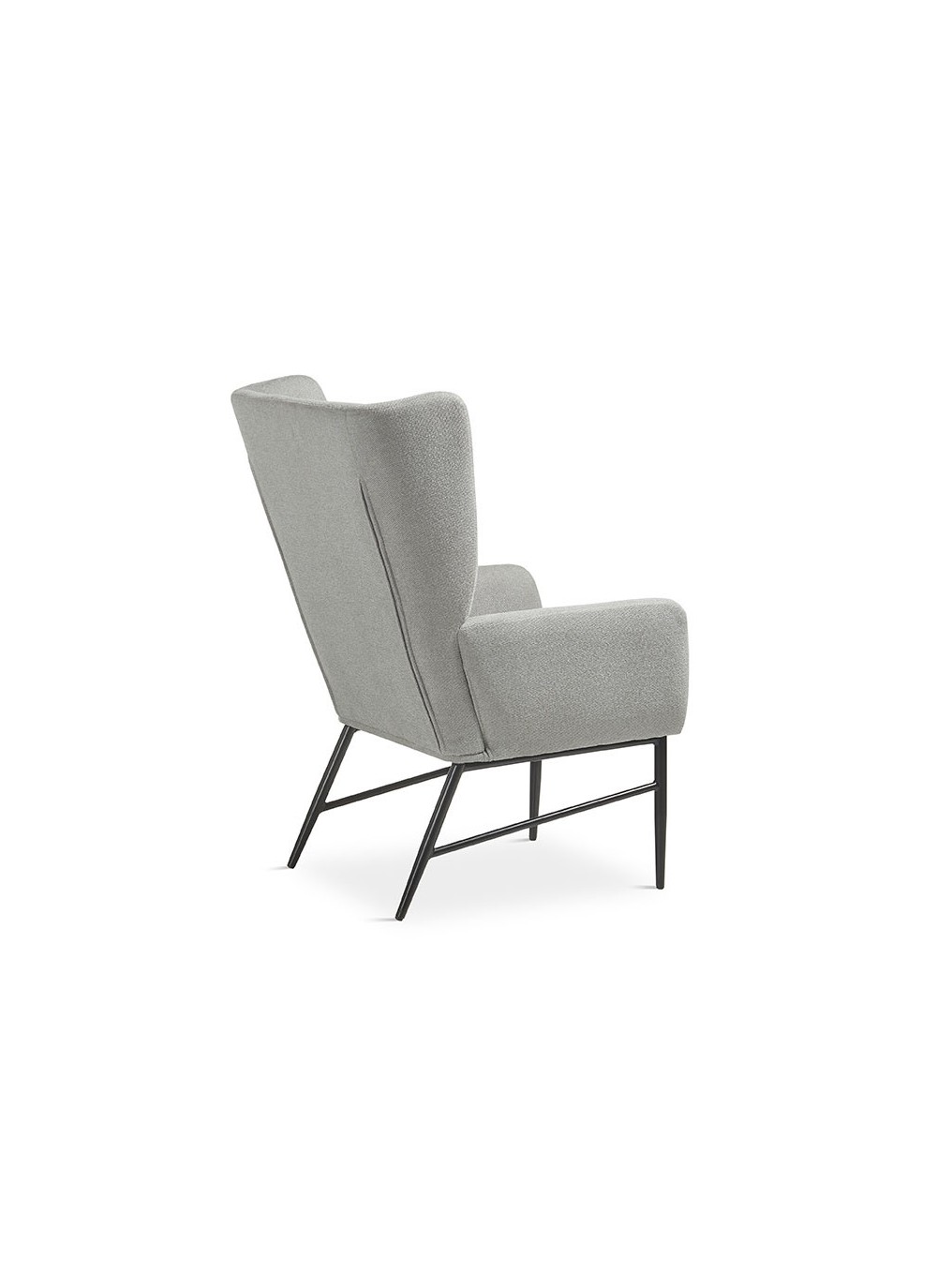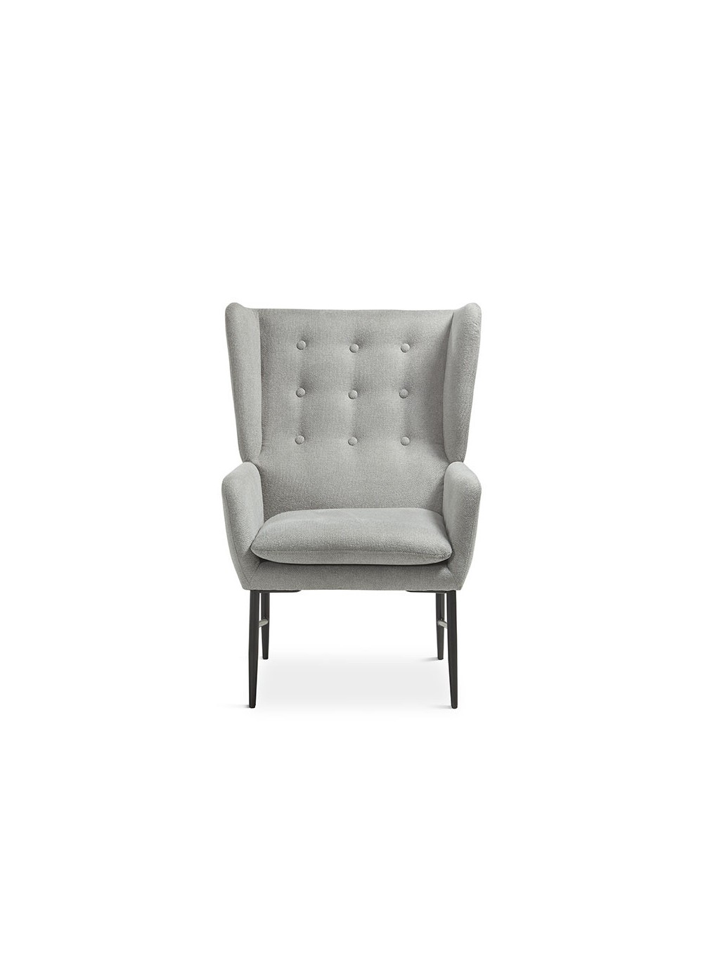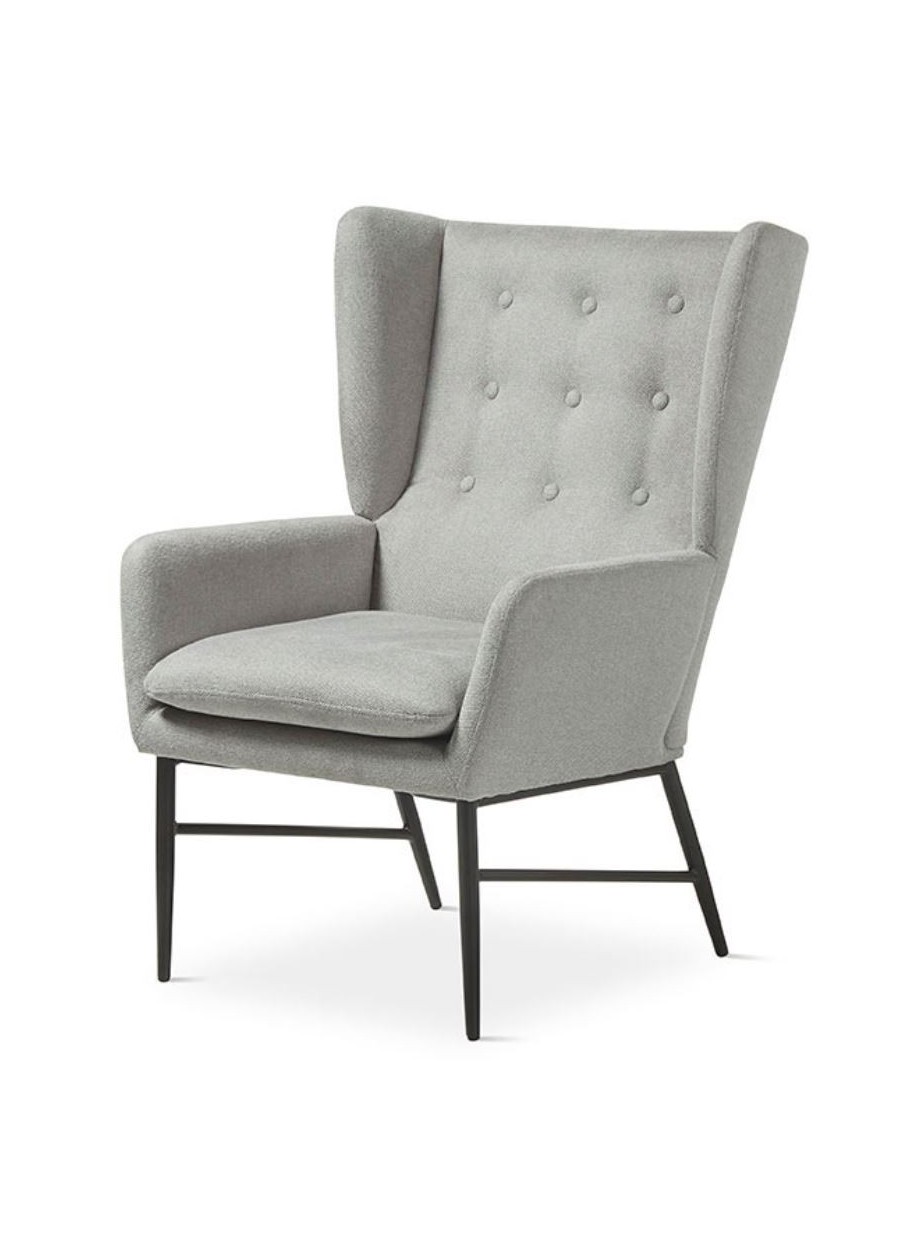 Butaca fabricada en tela acabado en gris , patas de metal color negro. Una pieza perfecta para combinar con ambientes Moderno.