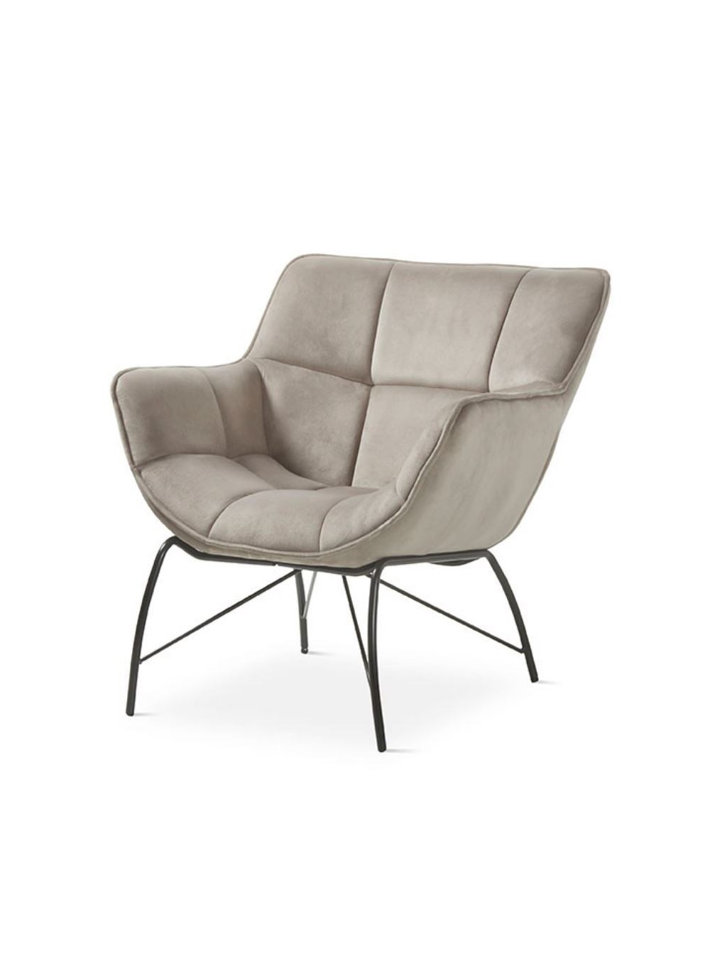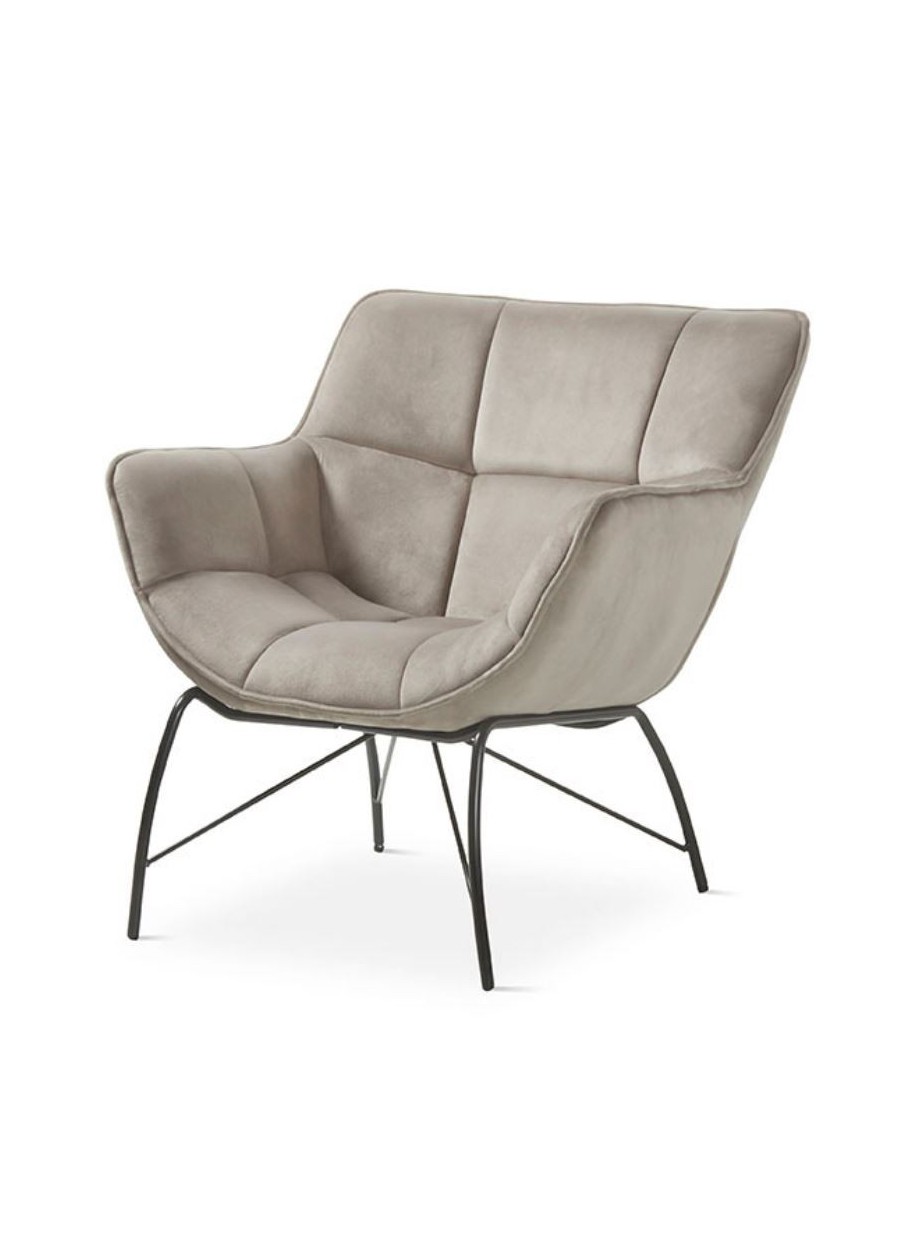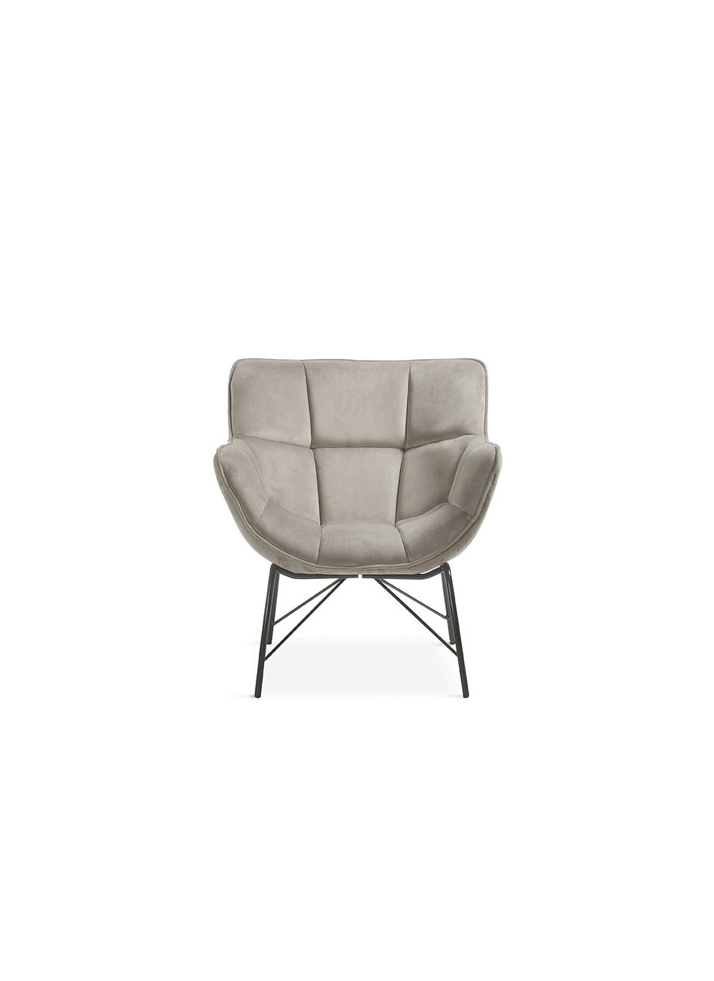 Butaca fabricada en tela acabado en Topo, patas de metal color negro. Una pieza perfecta para combinar con ambientes Moderno.